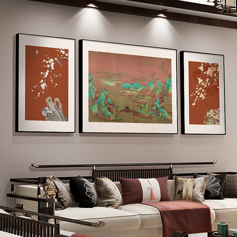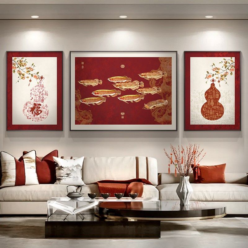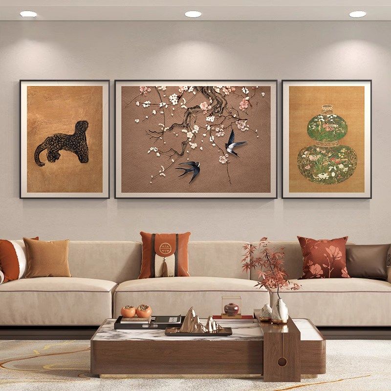 竹报平安中古风客厅沙发背景墙挂画三联装饰画复古中式壁画葫芦