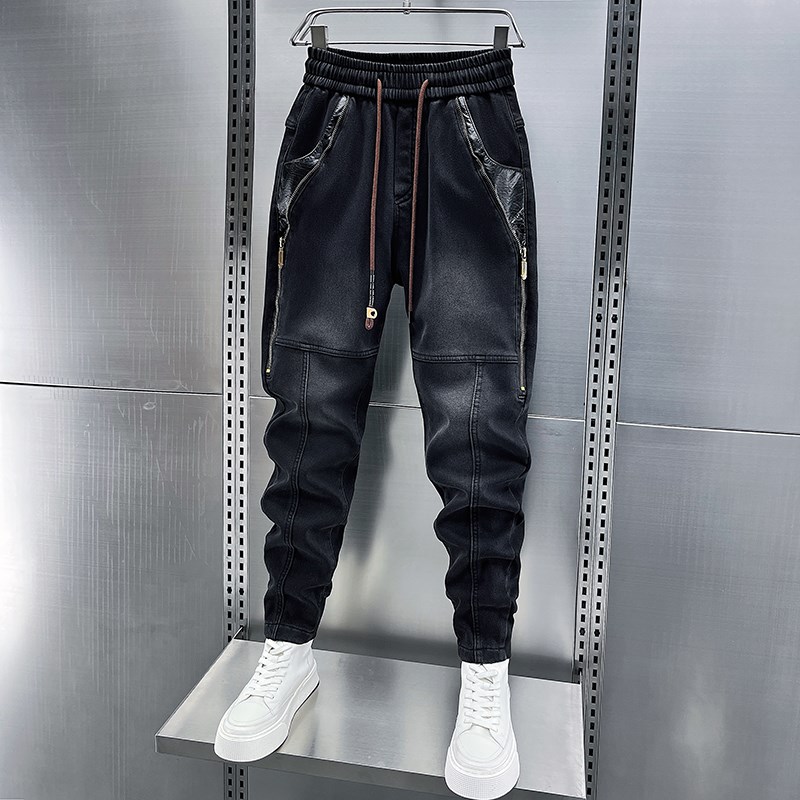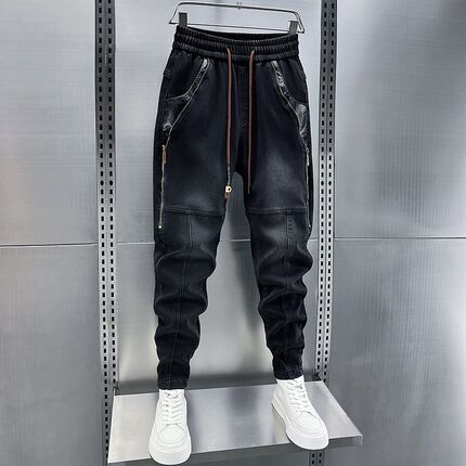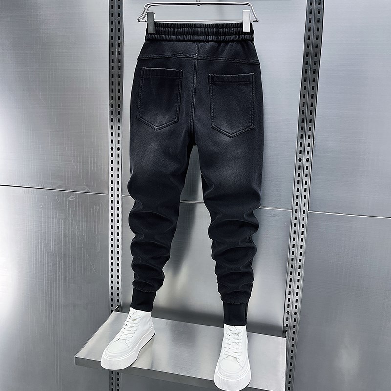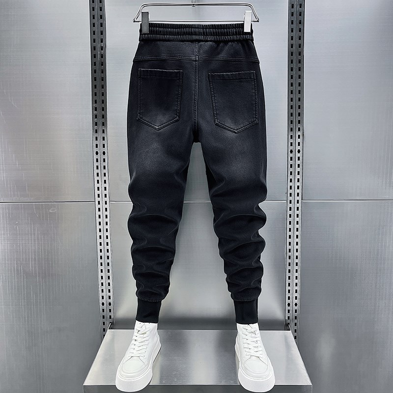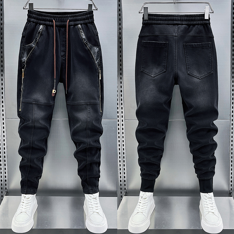 加绒加厚小脚牛仔裤男冬季个性男士松紧腰弹力拉链束脚休闲九分裤