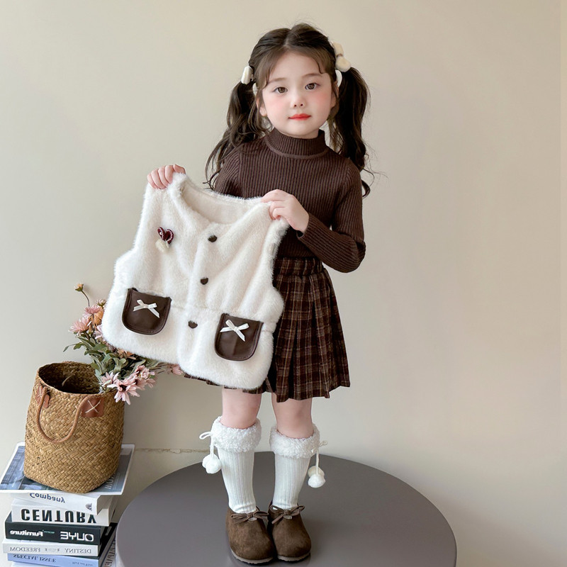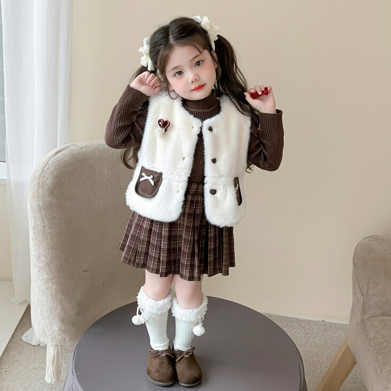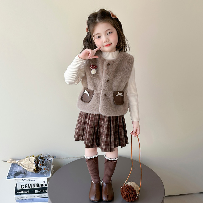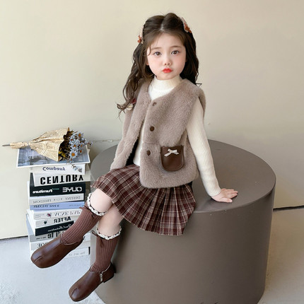 女童小香风套裙秋冬2025新款小女孩时髦仿皮草马甲三件套气质套装