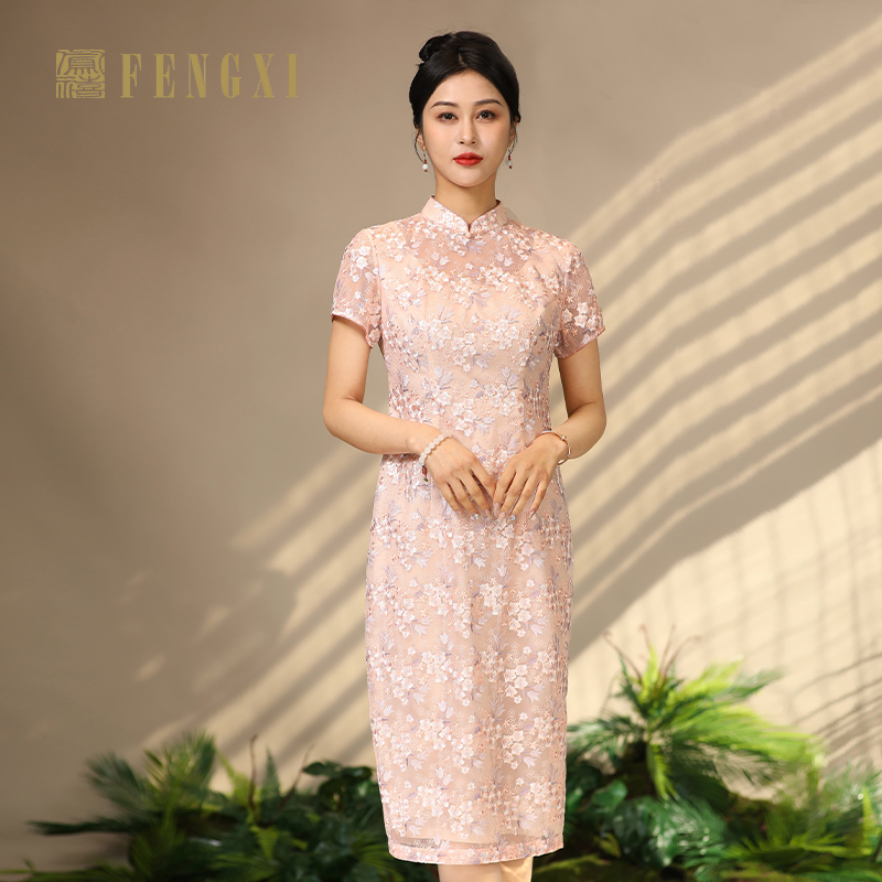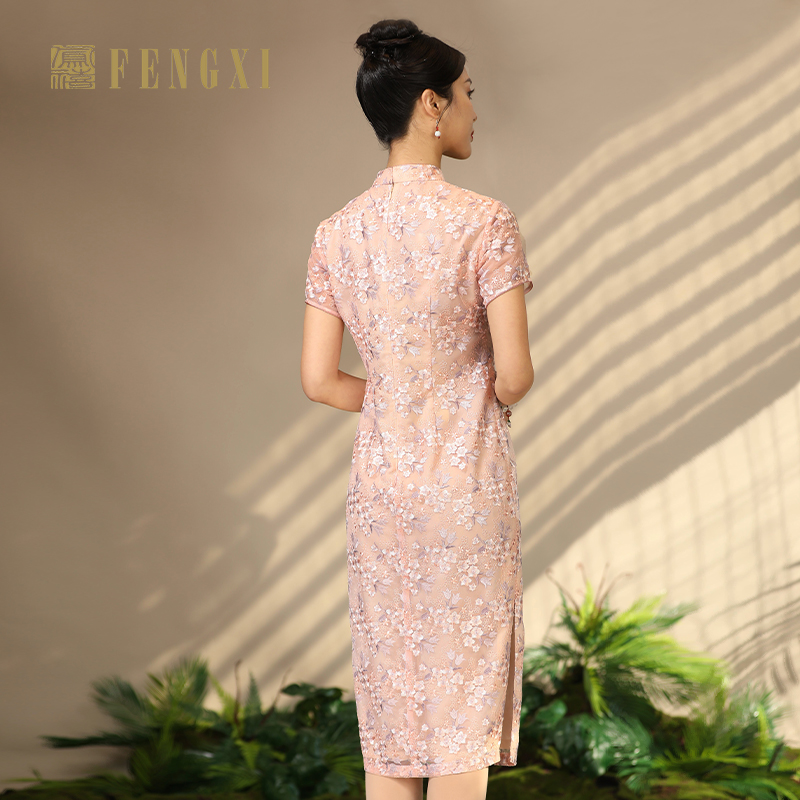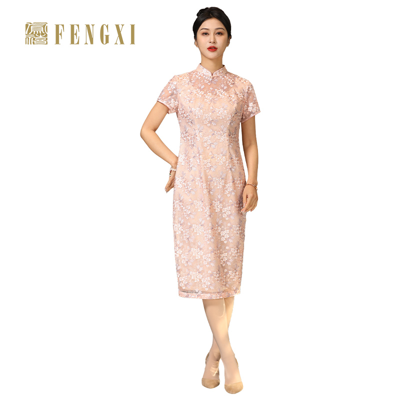 凤禧粉色蕾丝日常聚会出游淑女改良旗袍裙礼服年轻款2025新款夏季