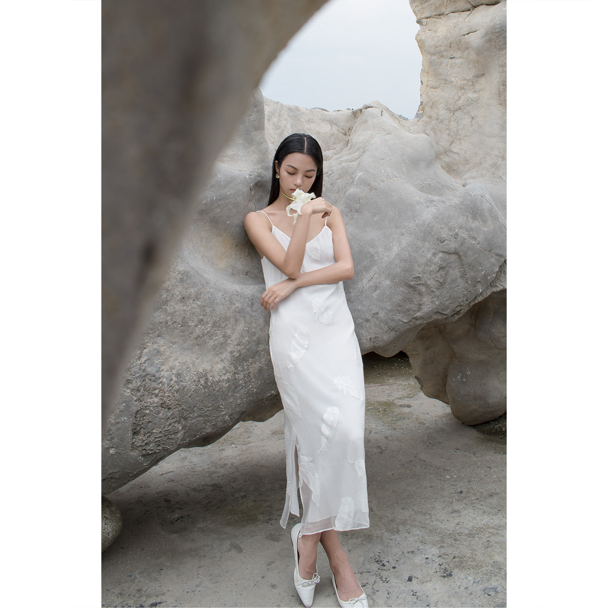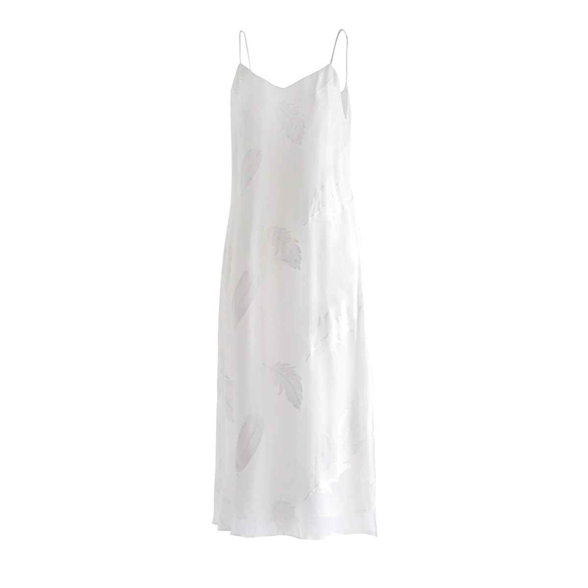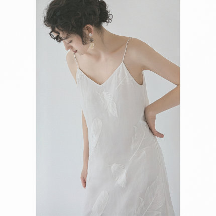 原隐YuanYin羽毛夏季复古chic长款白色吊带休闲连衣裙真丝长裙女