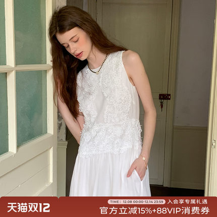 竹依依法式复古白色清冷感白月光蕾丝拼接无袖连衣裙女夏高级长裙