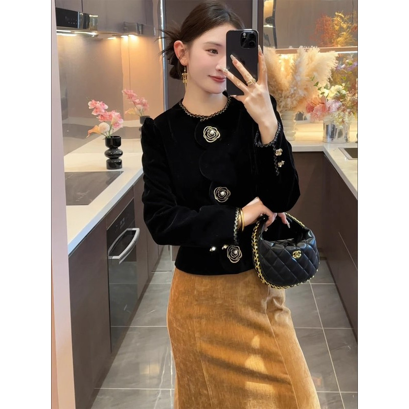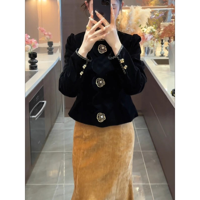 新中式复古风黑色外套鱼尾半身裙女2025秋冬新款温婉高级漂亮套装