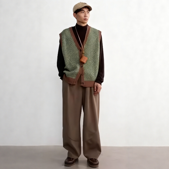 日系复古设计感绿色针织衫马甲男ins原宿撞色流行文艺毛衣开衫