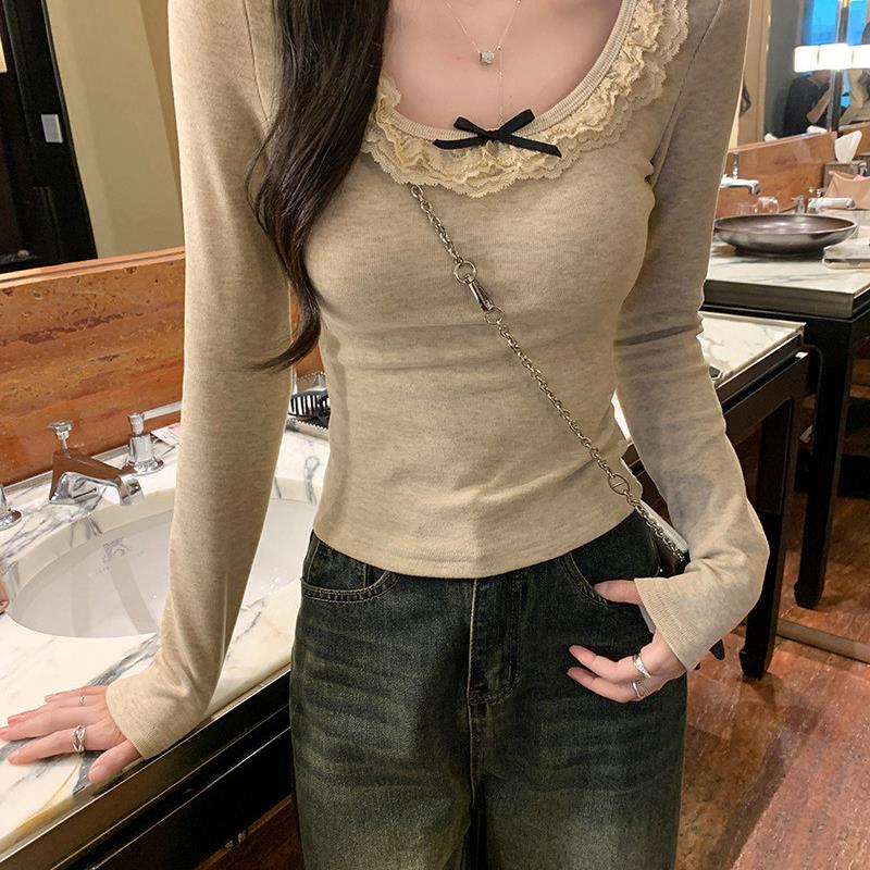 实拍250G绵羊绒长袖t恤女装2025早春新款蕾丝修身打底衫圆领上衣