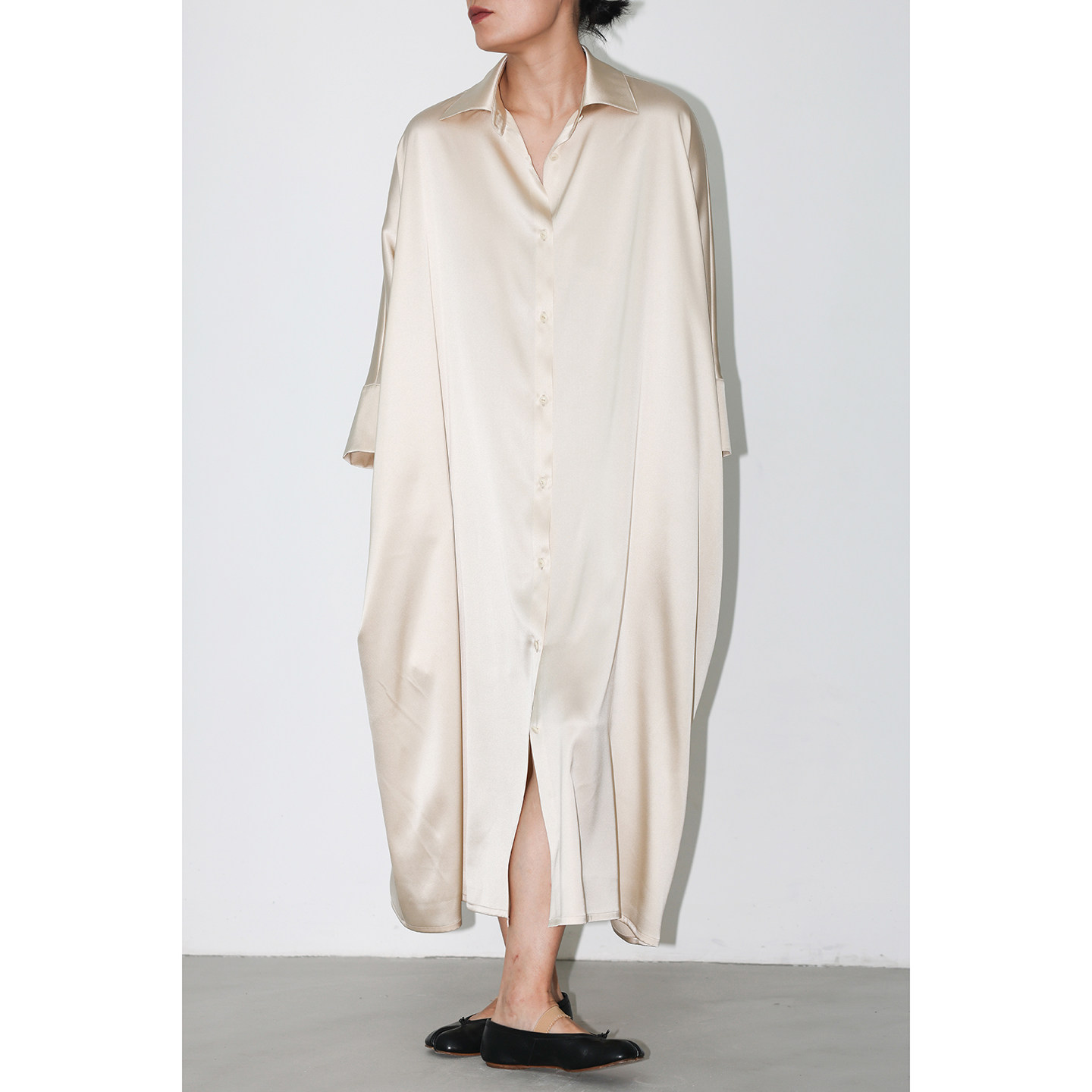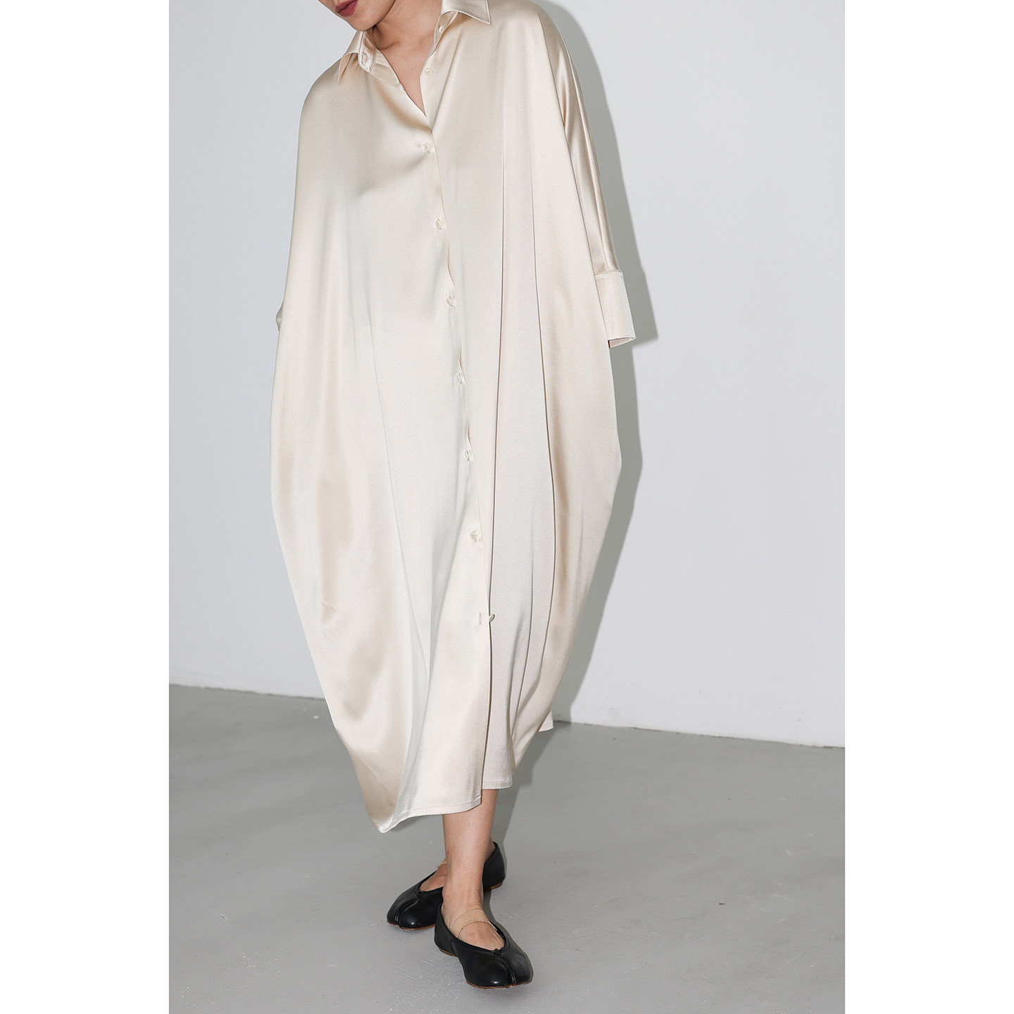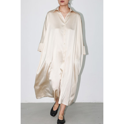 JUZININE原创设计真丝连衣裙桑蚕丝超宽松慵懒七分袖衬衣领长裙