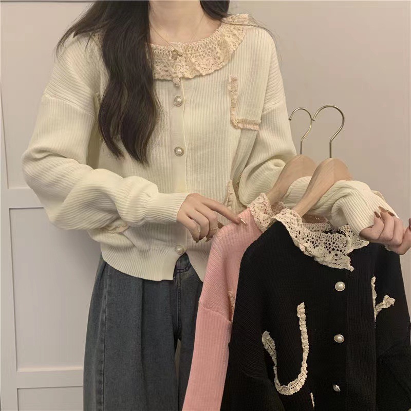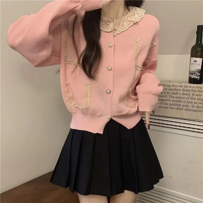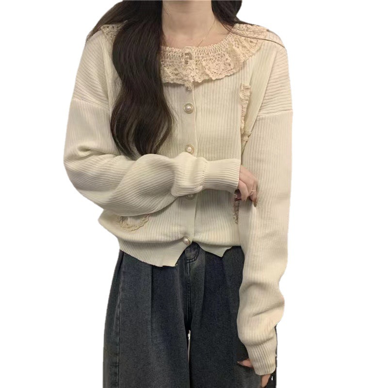拼接蕾丝花边翻领甜美可爱针织开衫女秋冬季长袖修身上衣小外套女