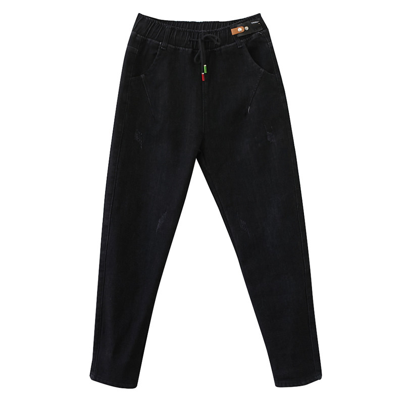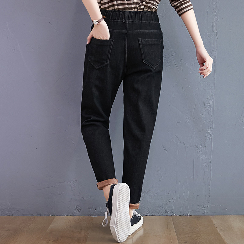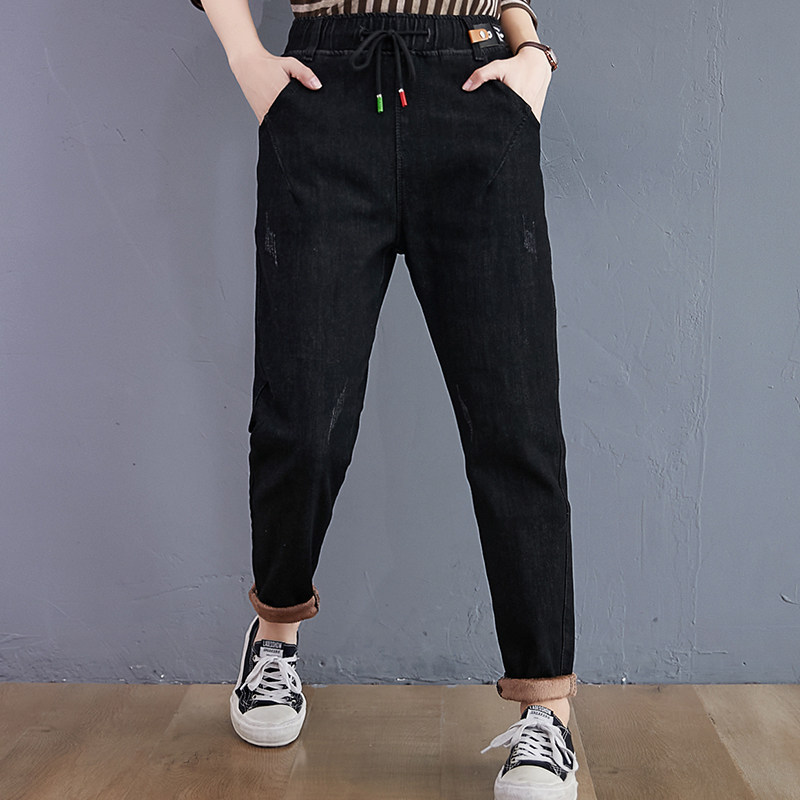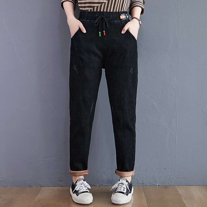 加绒加厚牛仔裤女2024新款冬季松紧腰弹力大码宽松显瘦小脚哈伦裤