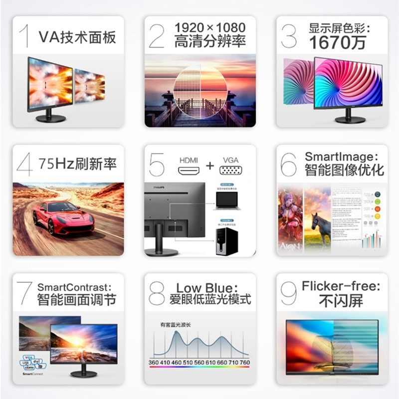 飞利浦 21.5英寸221S9 显示器 全高清 低蓝光不闪屏 HDMI+VGA