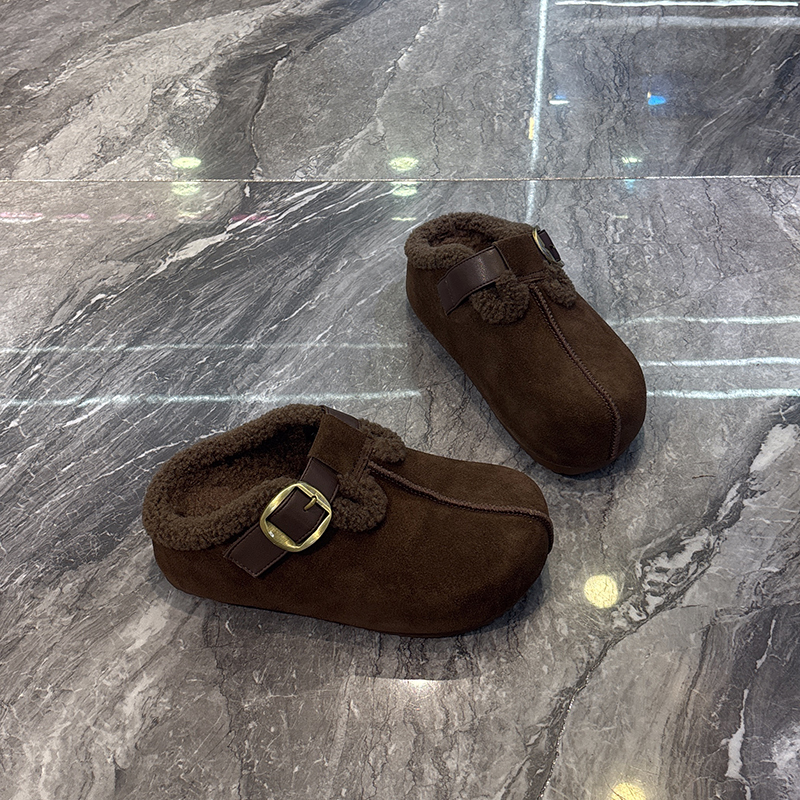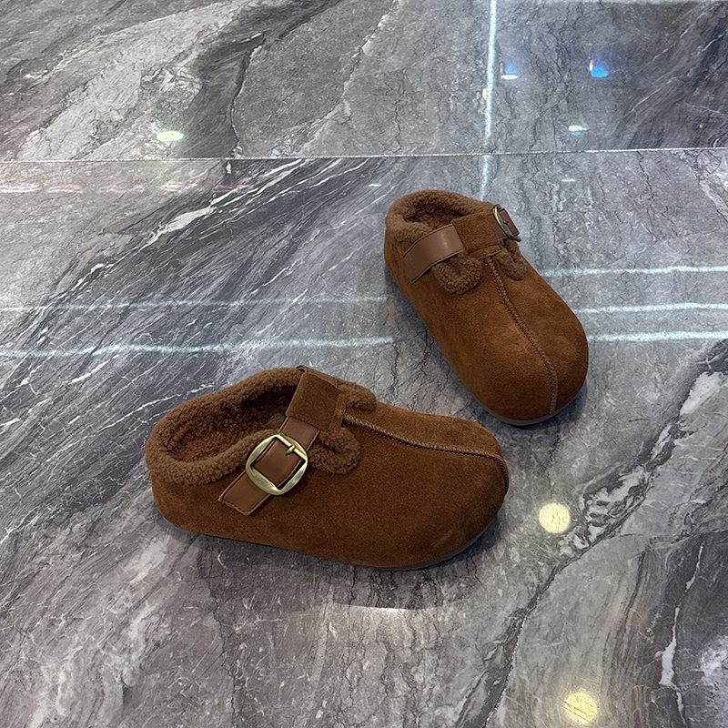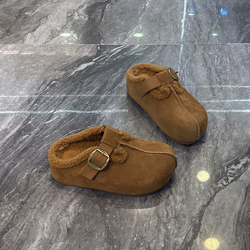 复古森系~真皮皮带扣包头拖女2025冬加绒保暖懒人一脚蹬勃肯拖鞋