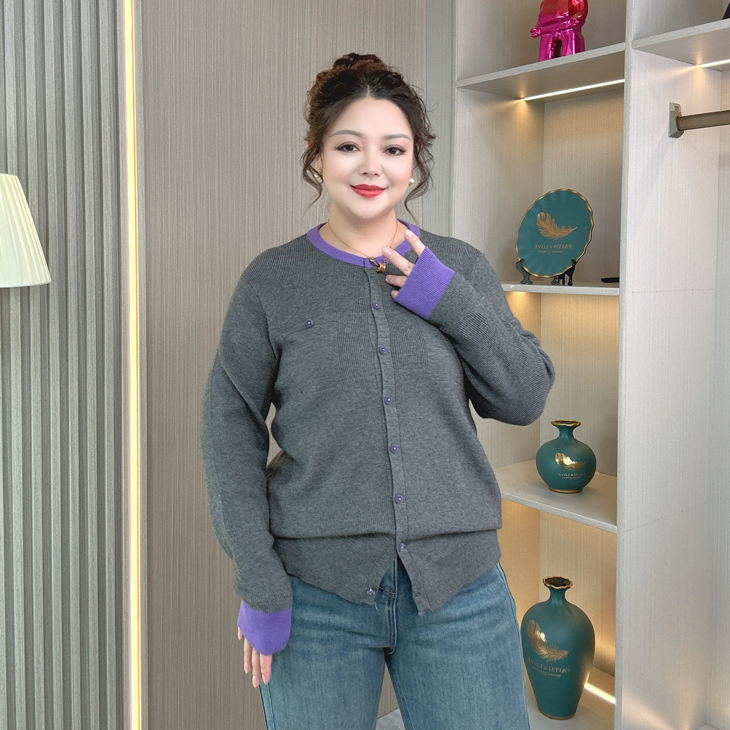 大码女装撞色圆领长袖宽松针织衫开衫女秋季胖mm百搭显瘦显白毛衣