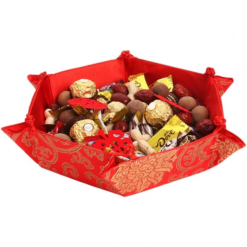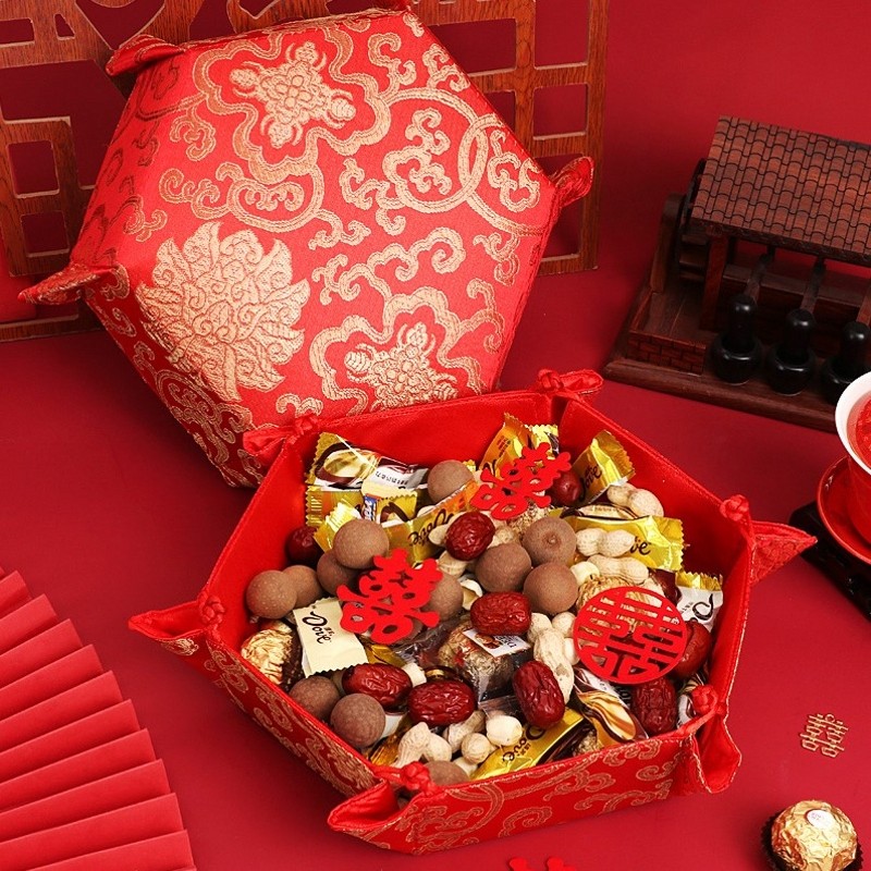 结婚红色布艺果盘中式婚庆用品喜盘婚宴待客瓜果盘婚礼喜糖锦缎盘