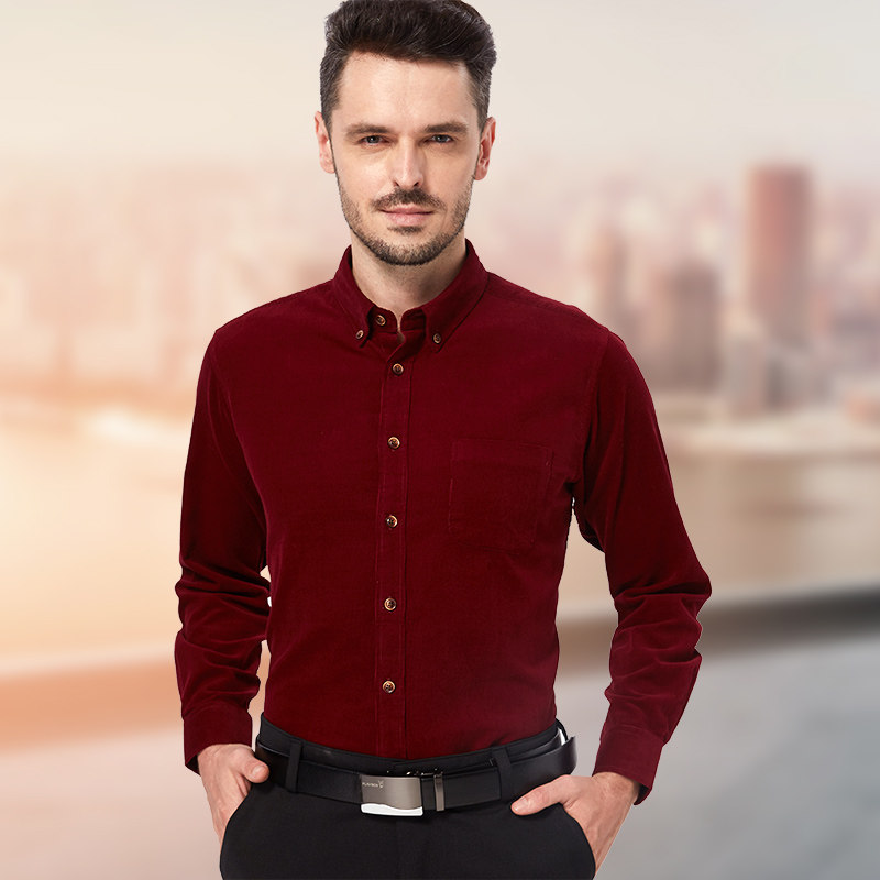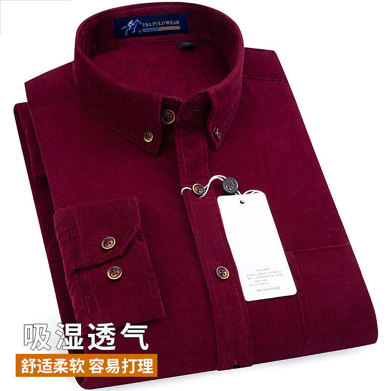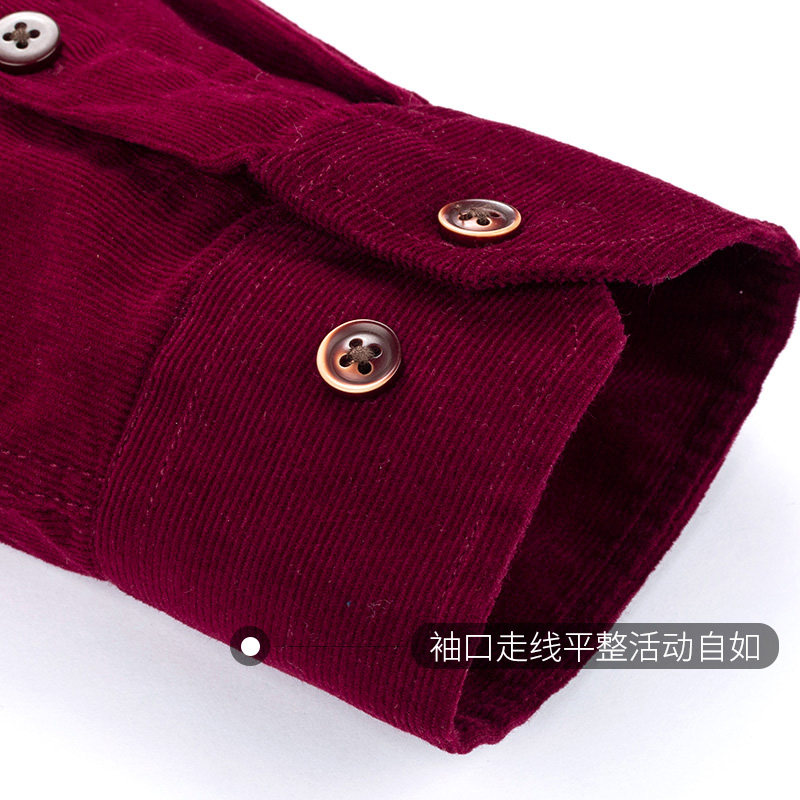 犸球保罗纯棉灯芯绒衬衫男长袖中年酒红色装全棉条绒男士休闲衬衣