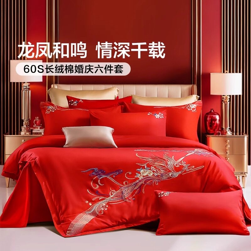 富安娜婚庆四件套红色喜庆提花被套床单结婚床上用品婚嫁床单被套