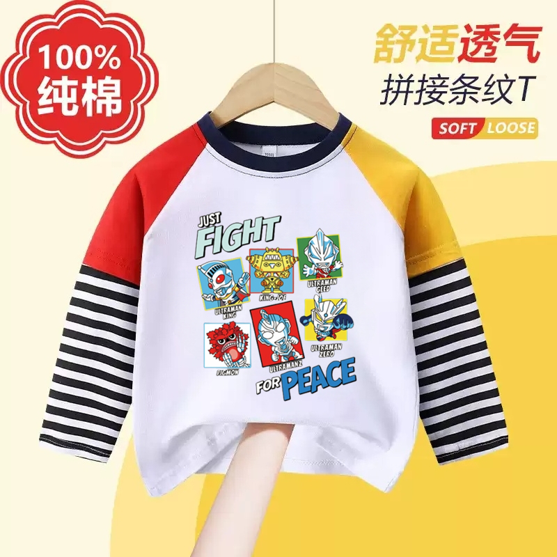 童装男童奥特曼撞色长袖T恤春秋款儿童纯棉衣服拼接条纹上衣秋装