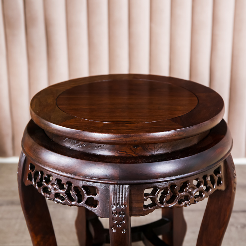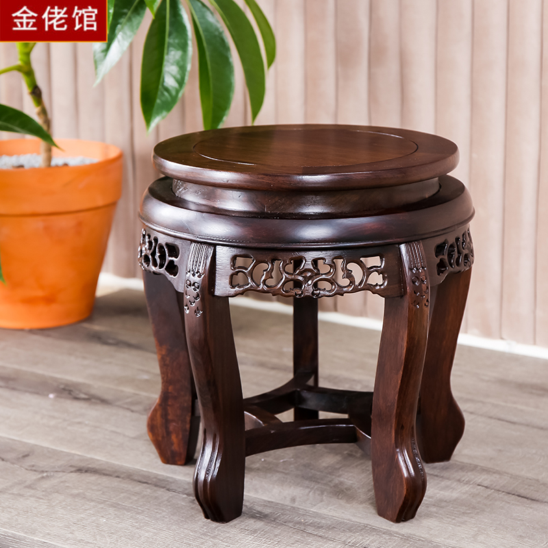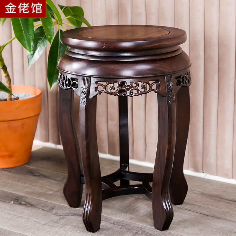 实木圆形客厅落地花架非洲黑檀木雕花瓶花盆石头底座摆件红木花几