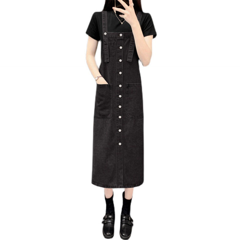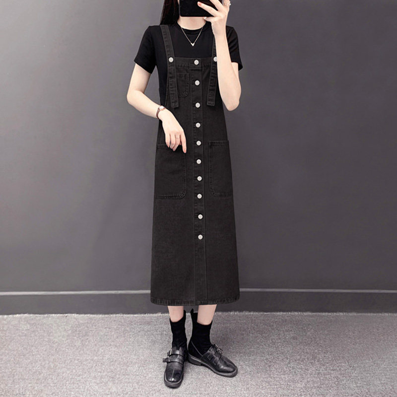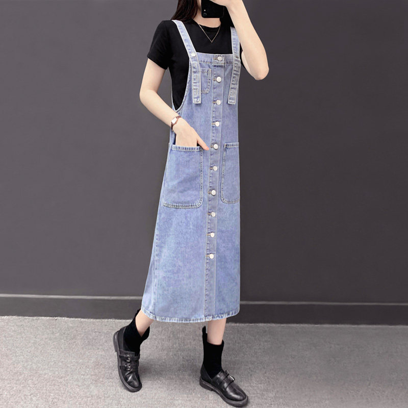 遮肉背带牛仔长裙吊带连衣裙排扣