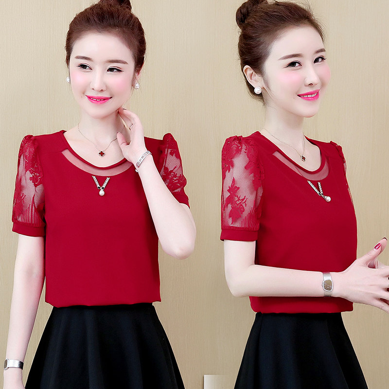 2025新款韩版蕾丝雪纺衫夏天短袖T恤女式百搭打底衫洋气显瘦上衣