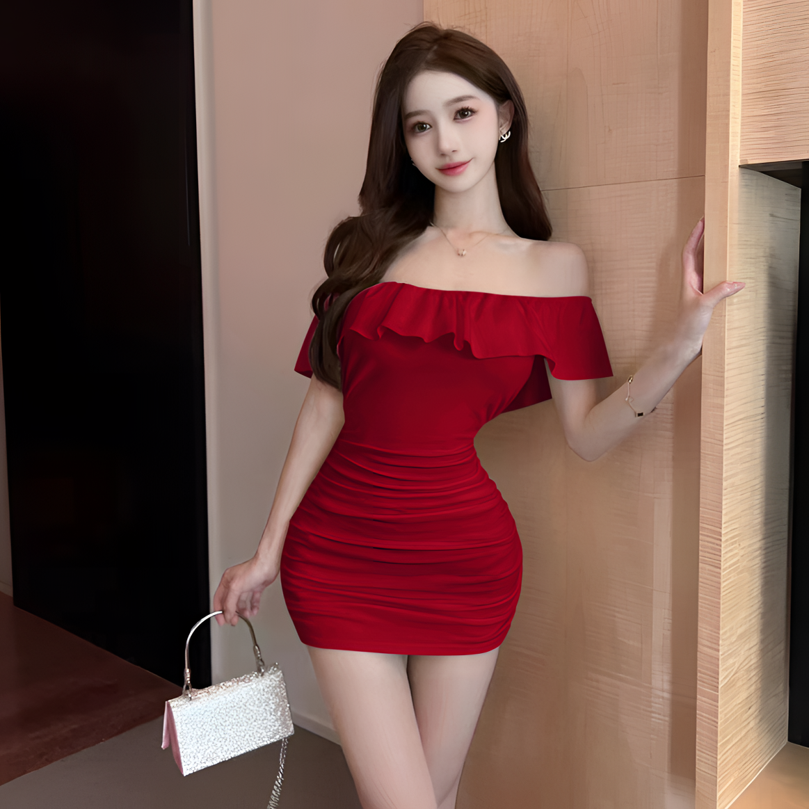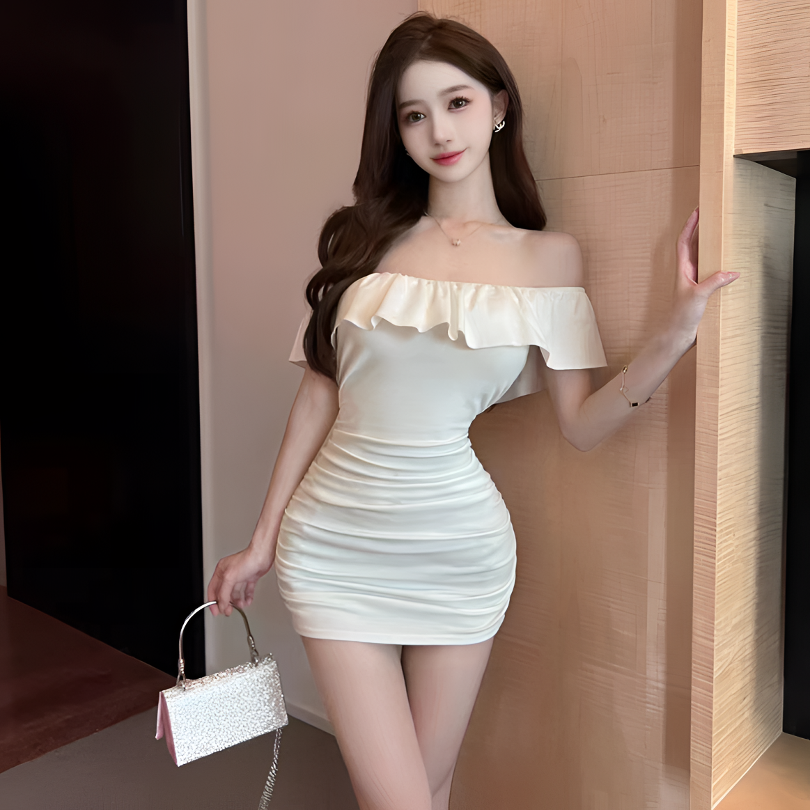 独特别致荷叶边抹胸包臀裙紧身性感一字肩气质显身材短款连衣裙夏