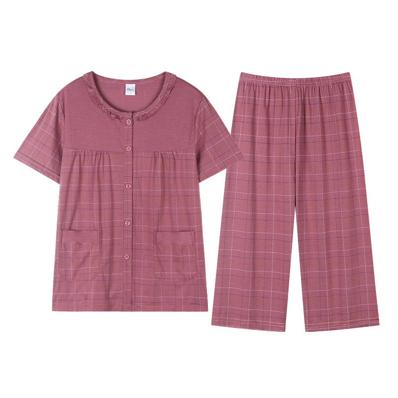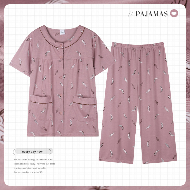 妈妈睡衣女夏季短袖七分裤纯棉薄款开衫中年人圆领家居服两件套装