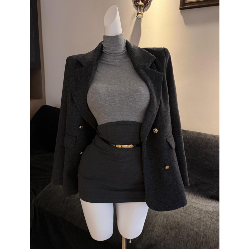 法式轻奢感简约风毛呢黑色西装宽松外套针织高领打底衣包臀裙套装