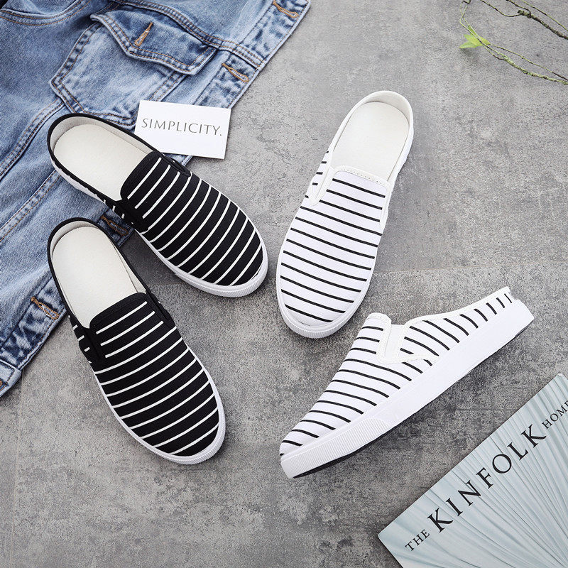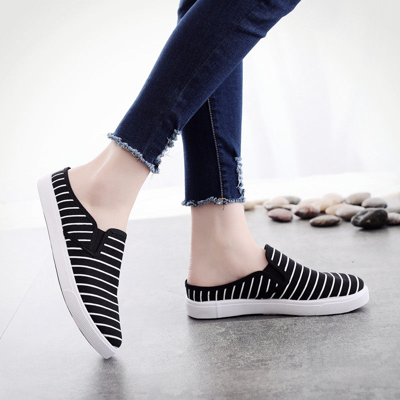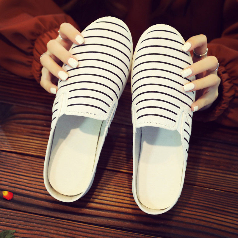 秋季半拖鞋无后跟帆布鞋女平底包头帆布拖鞋小白鞋女鞋平跟懒人鞋