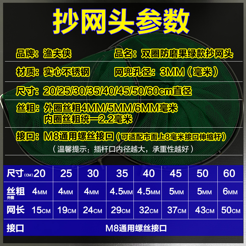 实心不锈钢双圈防磨抄网头M8接口小孔捞鱼网兜钓鱼抄小鱼小虾泥鳅