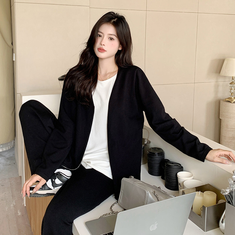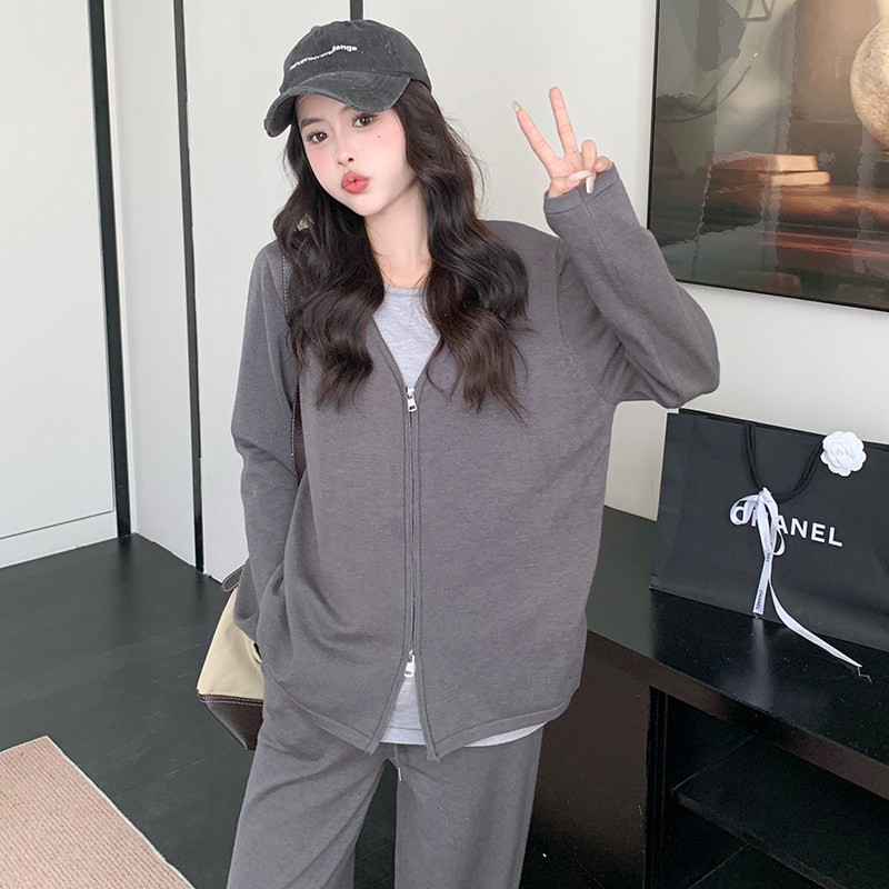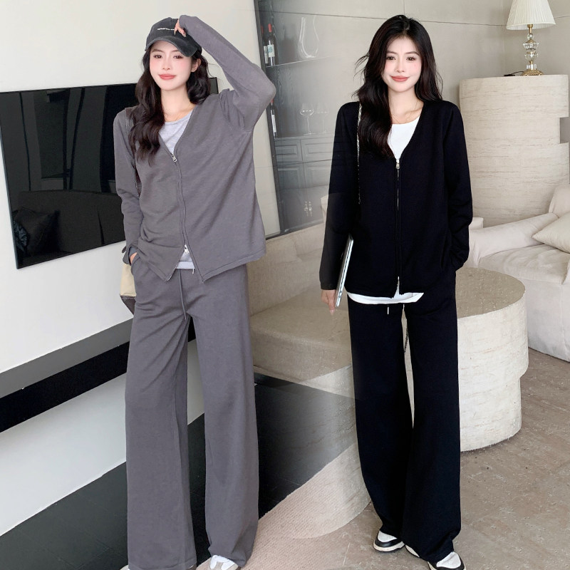 实拍~大码时尚套装秋季长袖上衣胖MM休闲运动直筒阔腿裤子两件套