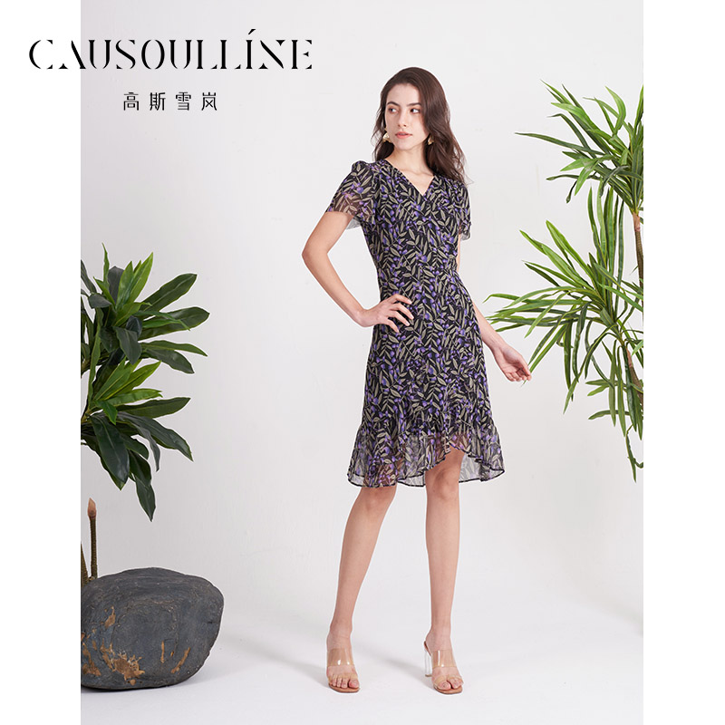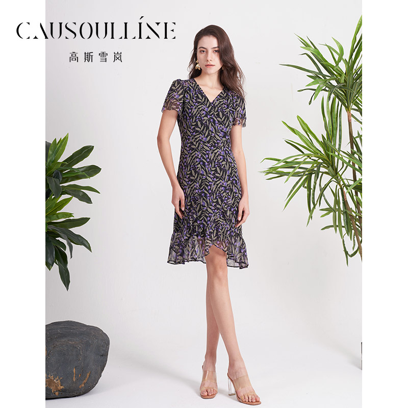 高斯雪岚2024夏装新款V领气质印花雪纺连衣裙荷叶边优雅鱼尾裙