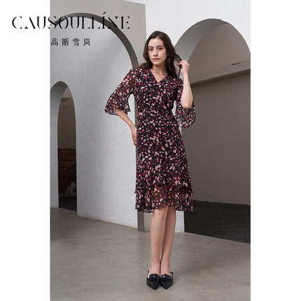 高斯雪岚2024夏季新款法式印花V领荷叶边清爽优雅连衣裙显瘦女装