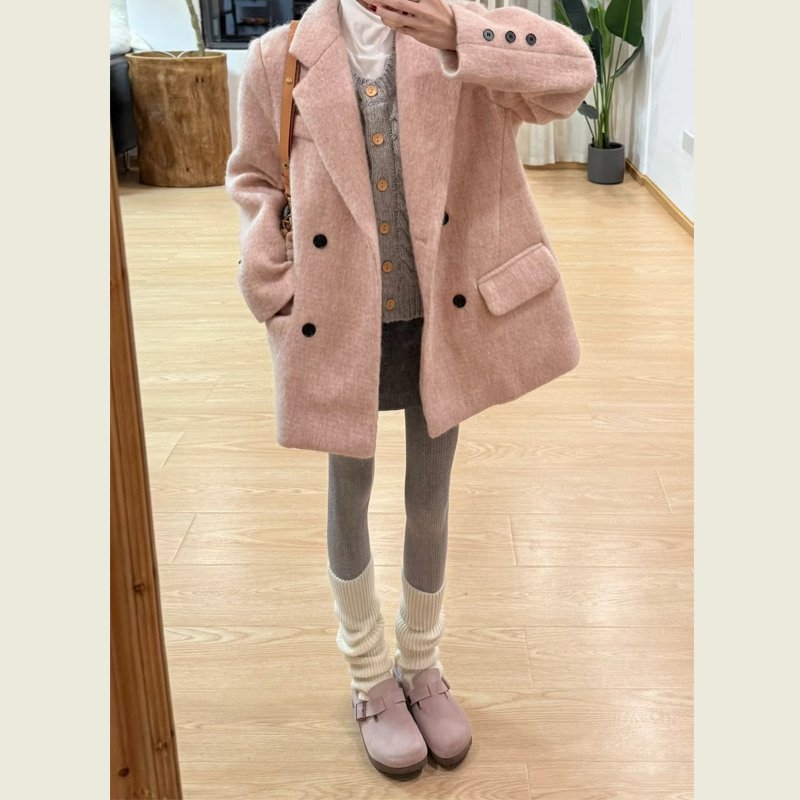 甜美温柔风粉色呢子西装外套女秋冬季小个子双排扣减龄毛呢大衣