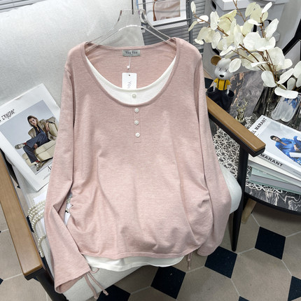 胡子叔大码女装春秋新款设计感时髦假两件长袖针织衫遮肚打底毛衣