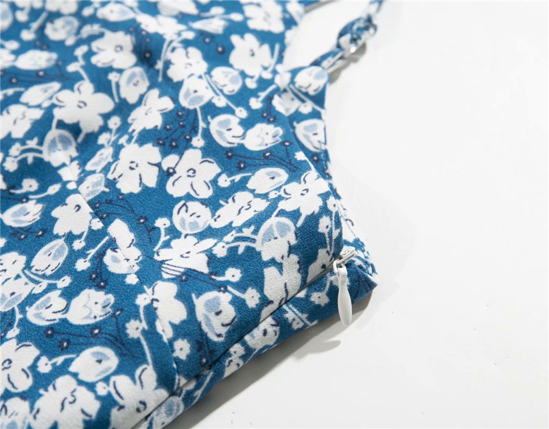 法式小众夏季新款吊带裙时尚无袖露肩蓝色碎花连衣裙小个子复古裙