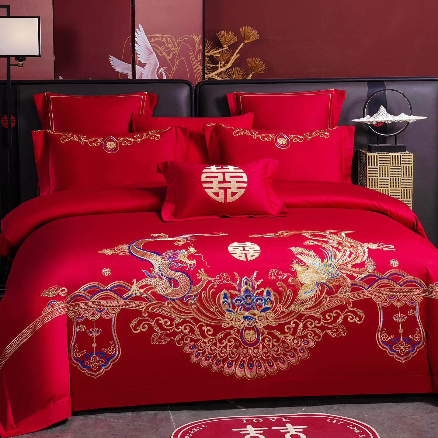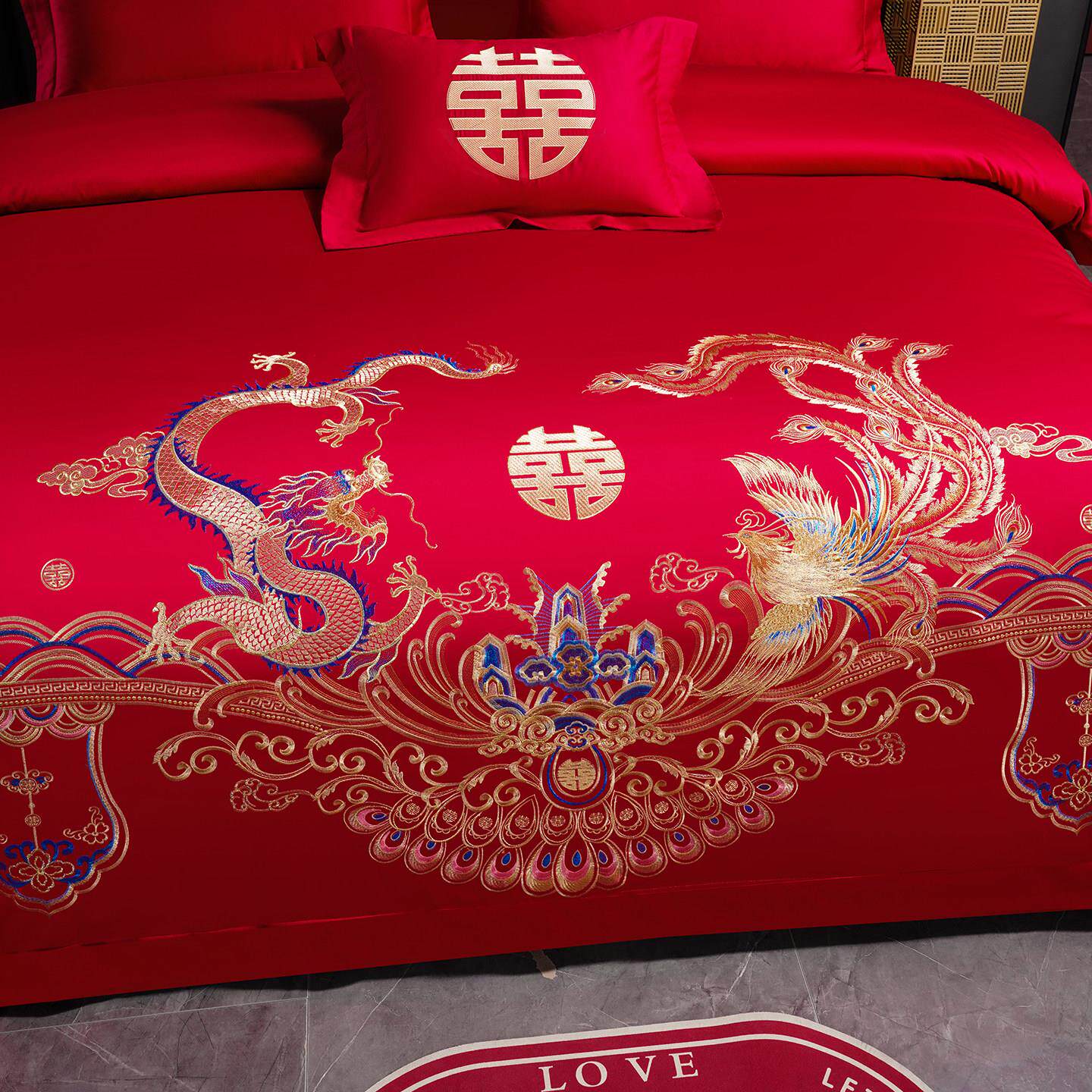 高档龙凤刺绣大红色婚庆四件套喜被套新婚房床单结婚床上用品婚嫁