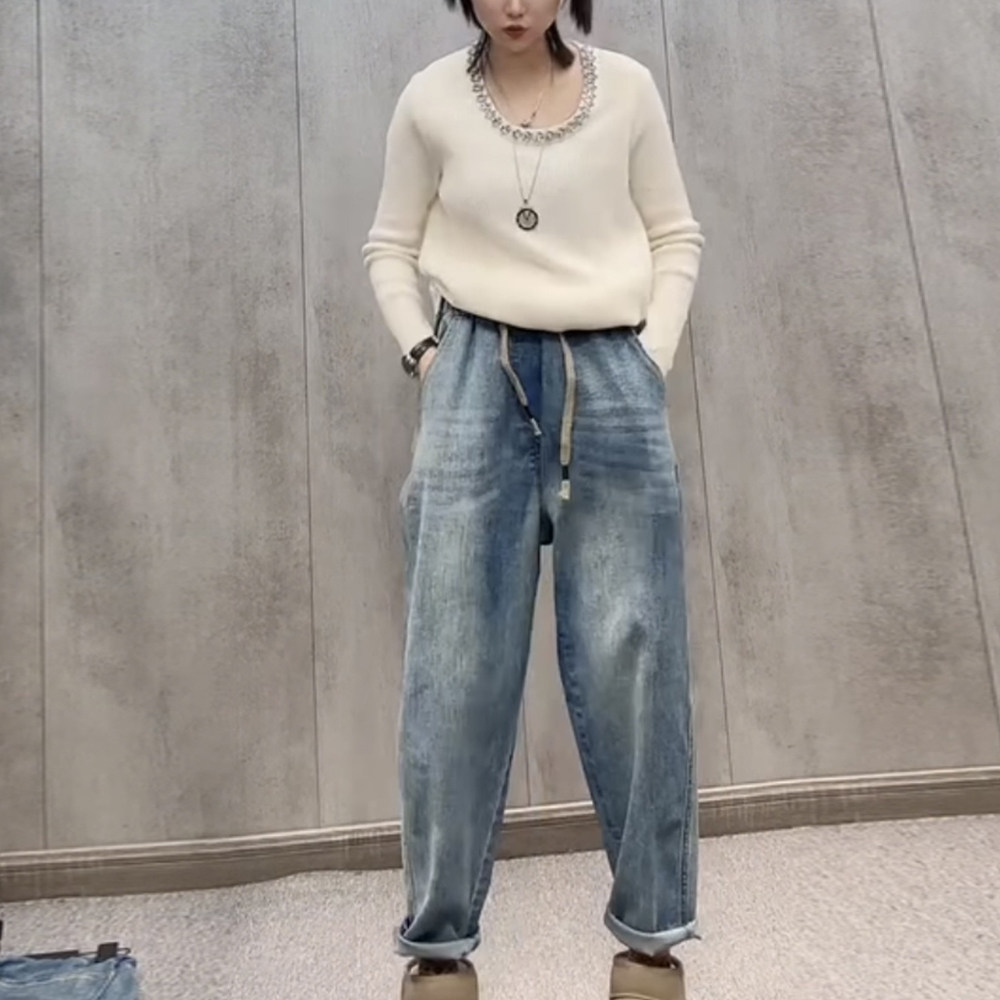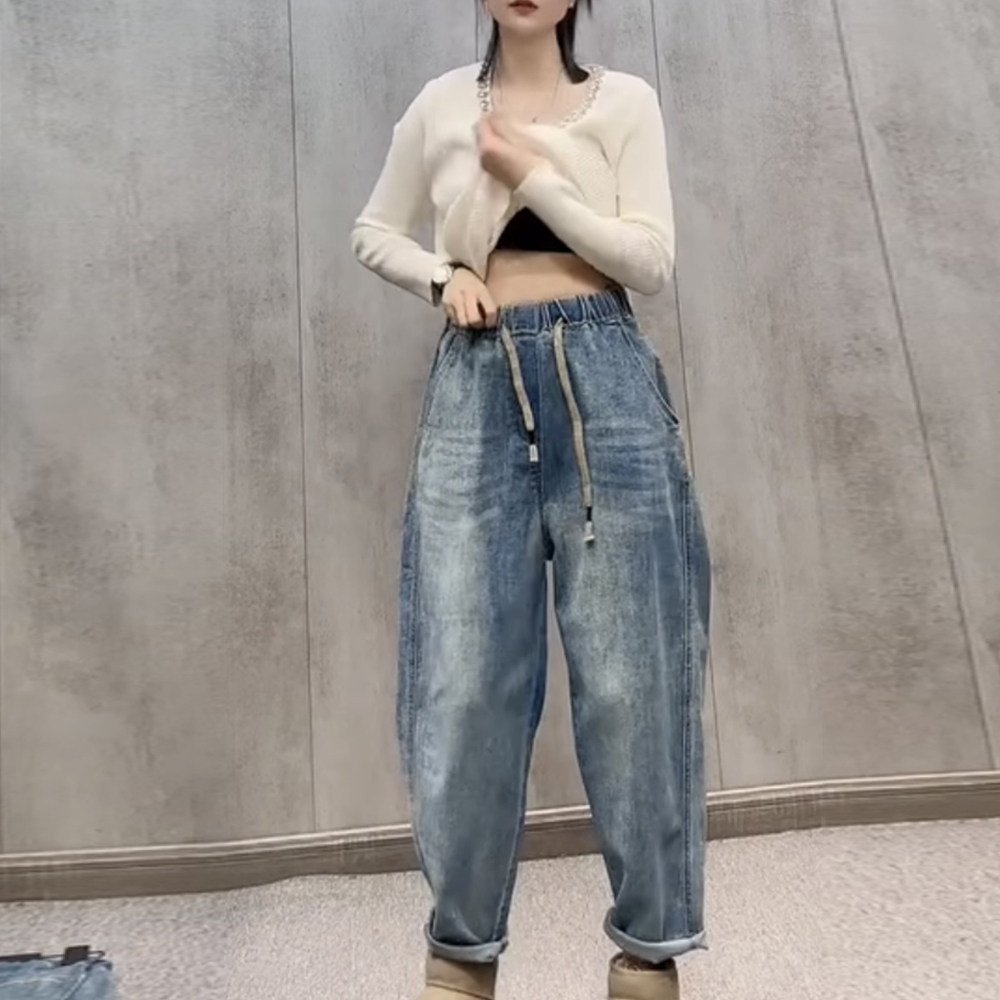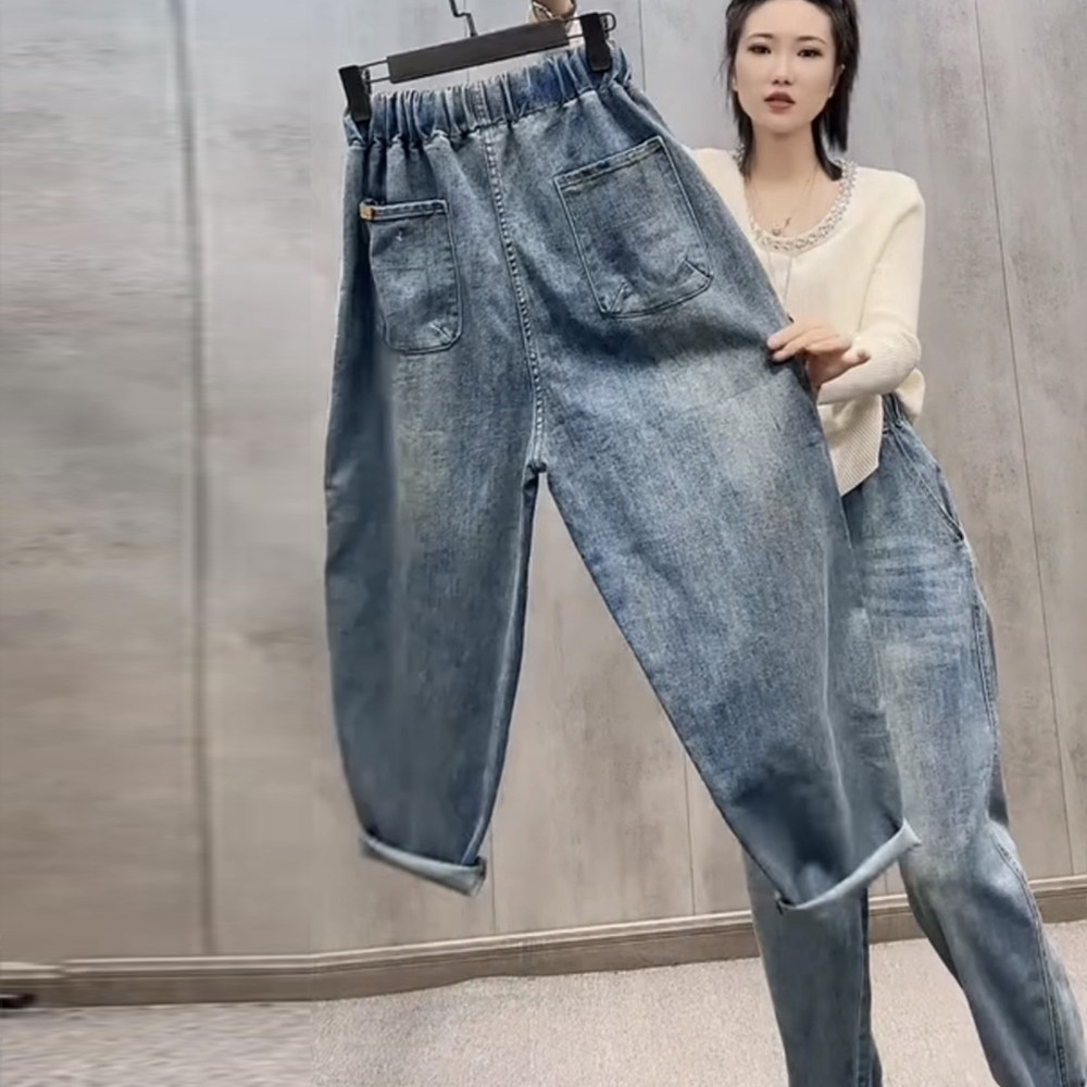 春秋新款松紧腰牛仔裤女宽松欧货遮肉显瘦哈伦裤大码收腰老爹裤子
