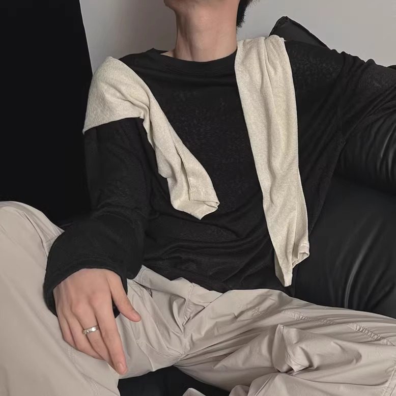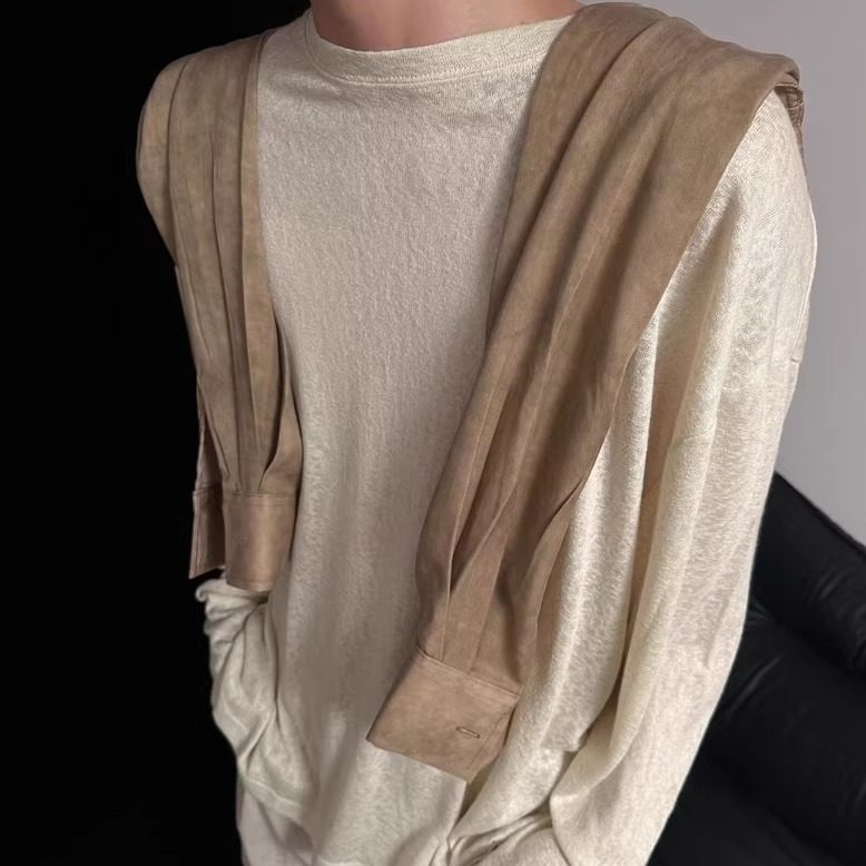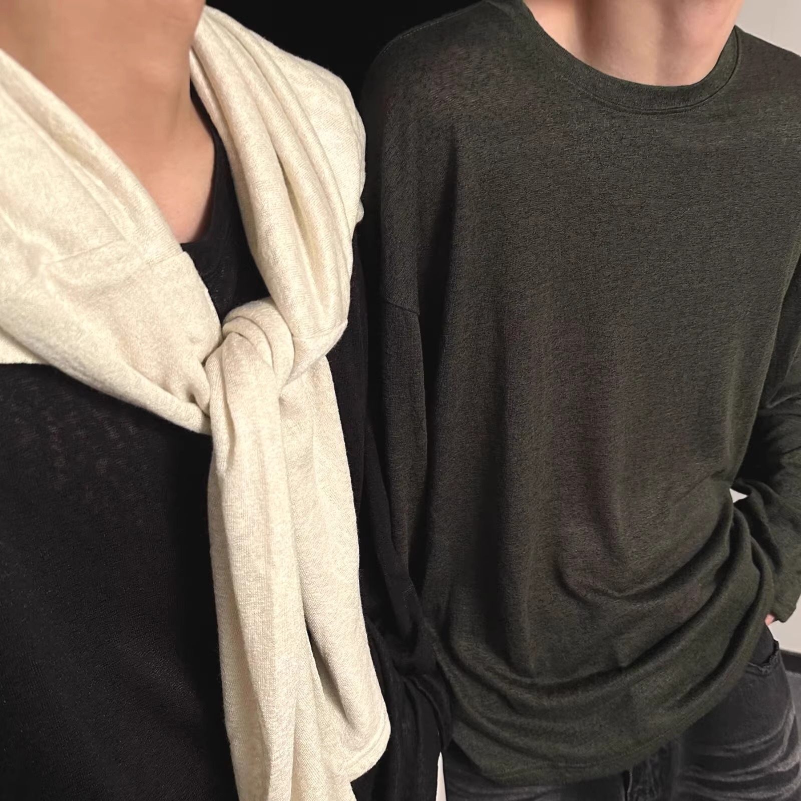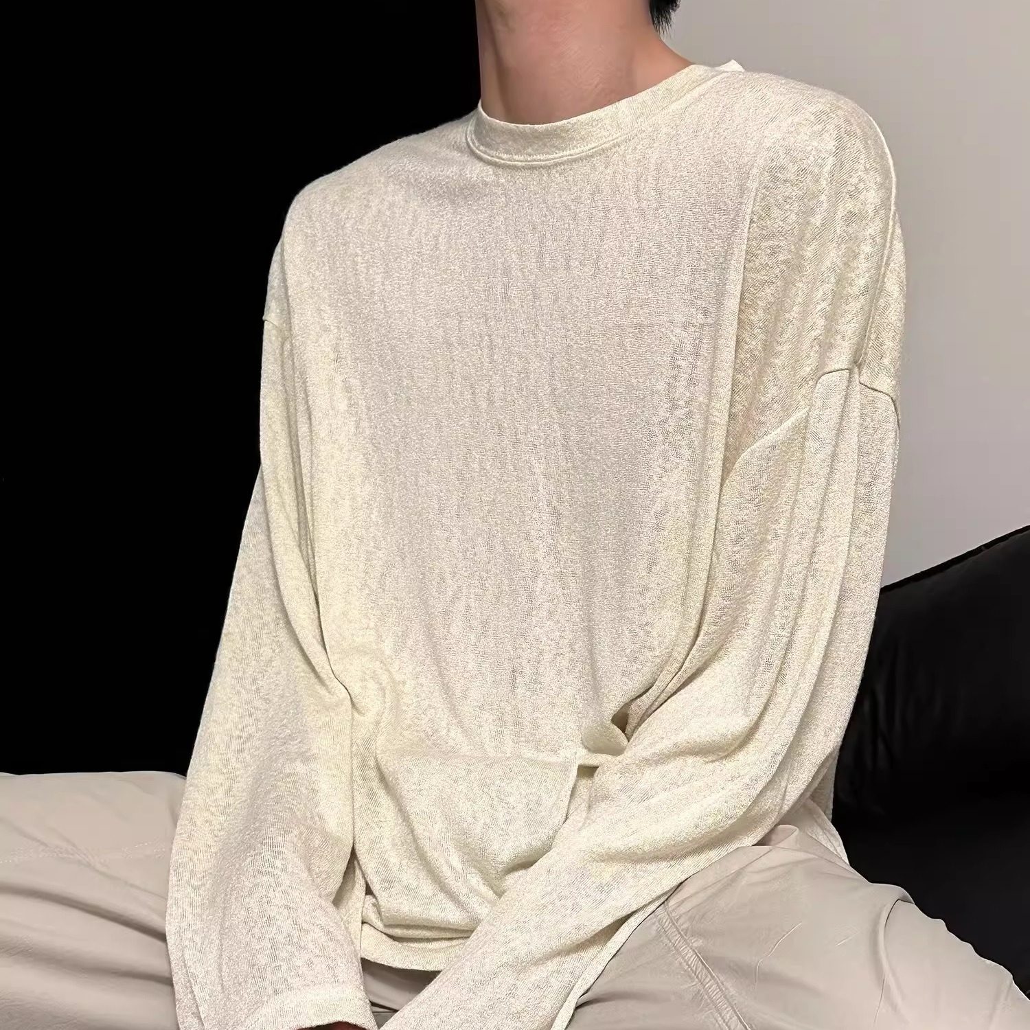 慵懒松弛感天丝亚麻t恤男轻薄微透长袖罩衫竹节冰感面膜防晒衣潮
