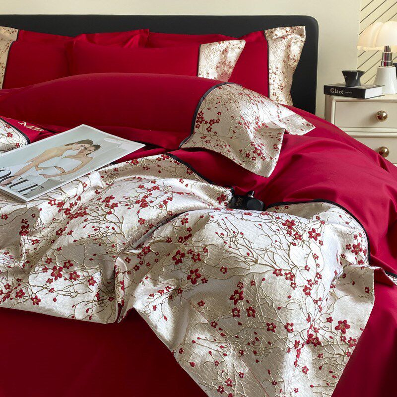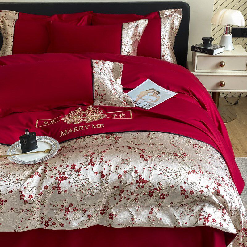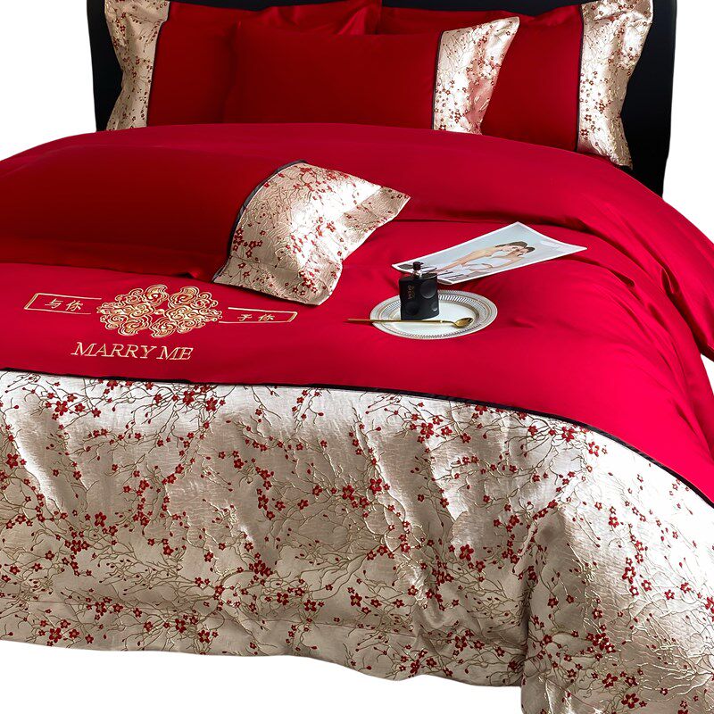 高档中式婚庆四件套大红s色床单被套纯棉新婚结婚床上用品婚房喜