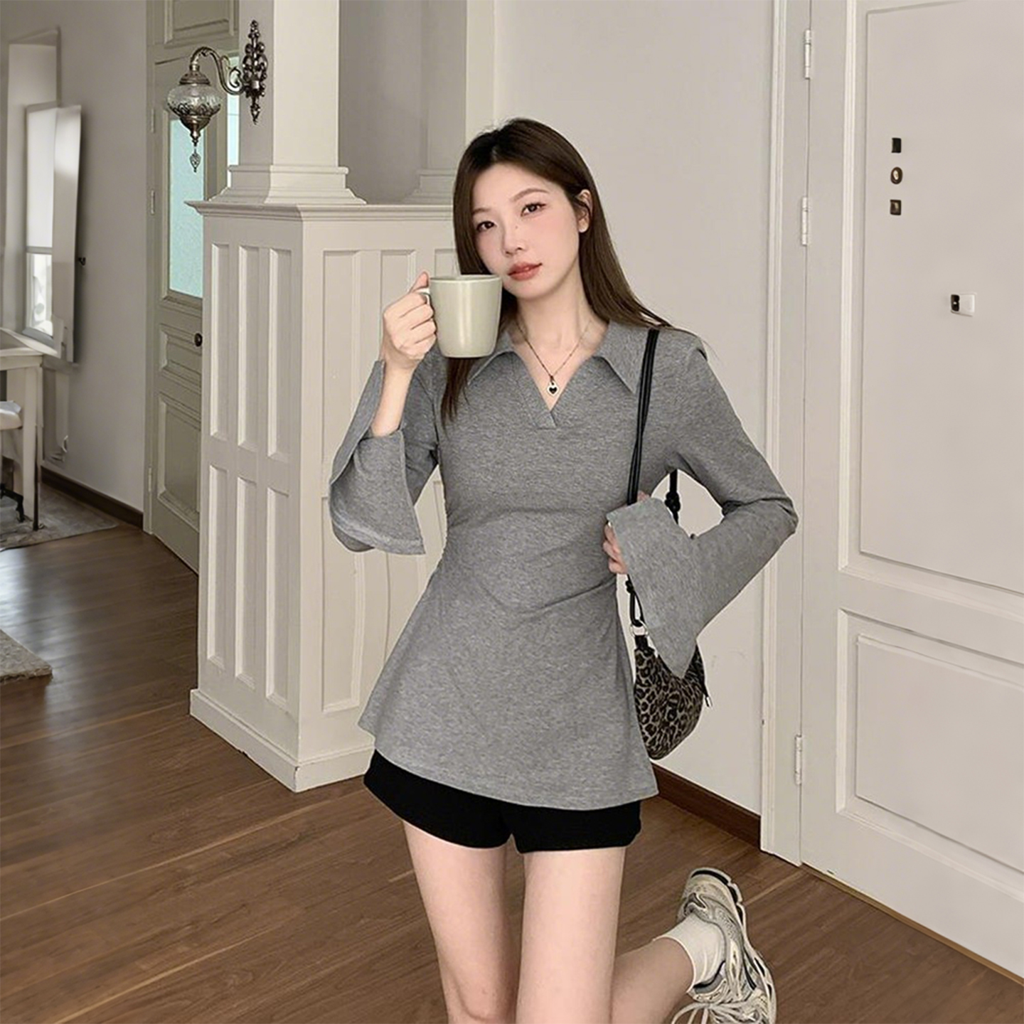 大码女装胖mm设计感V领长袖T恤
