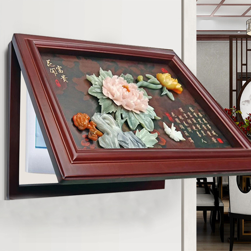 新中式电表箱装饰画玉雕竖款中国风实木雕免打孔配电电闸箱遮挡画