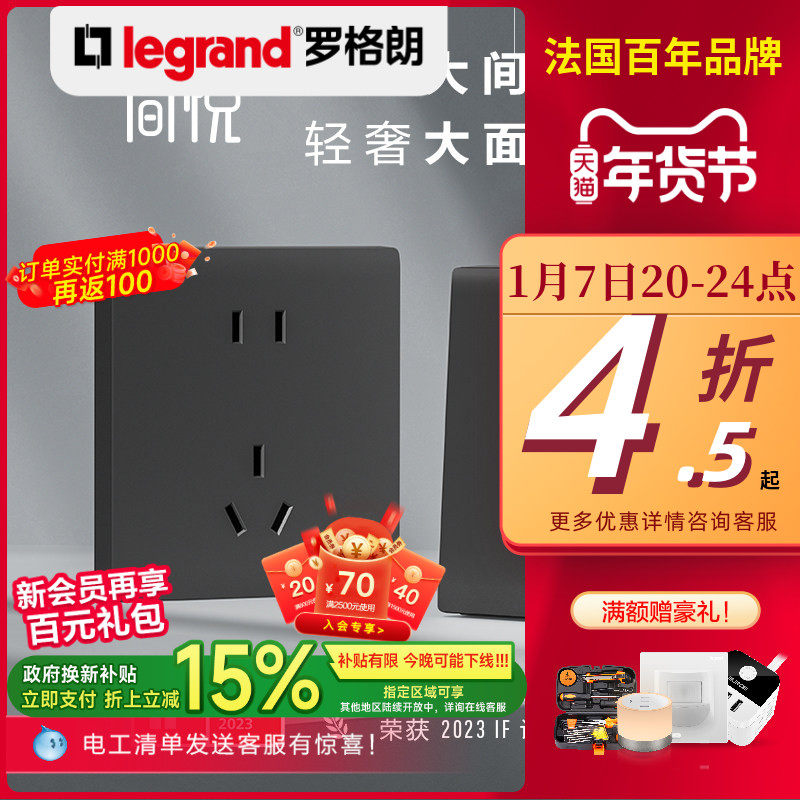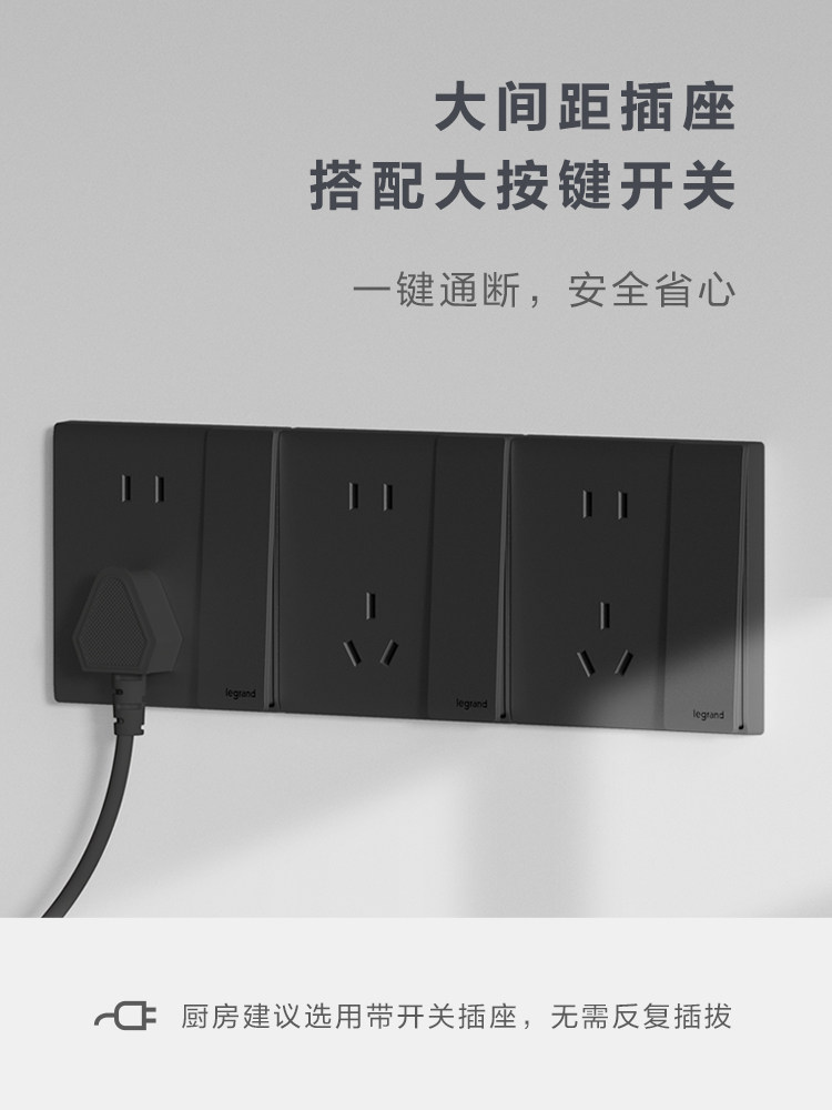 罗格朗五孔开关插座面板简悦石墨黑16a内嵌式二三插家用电源86型