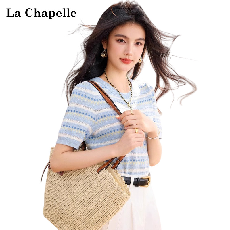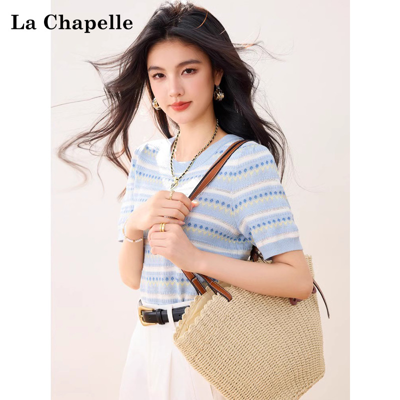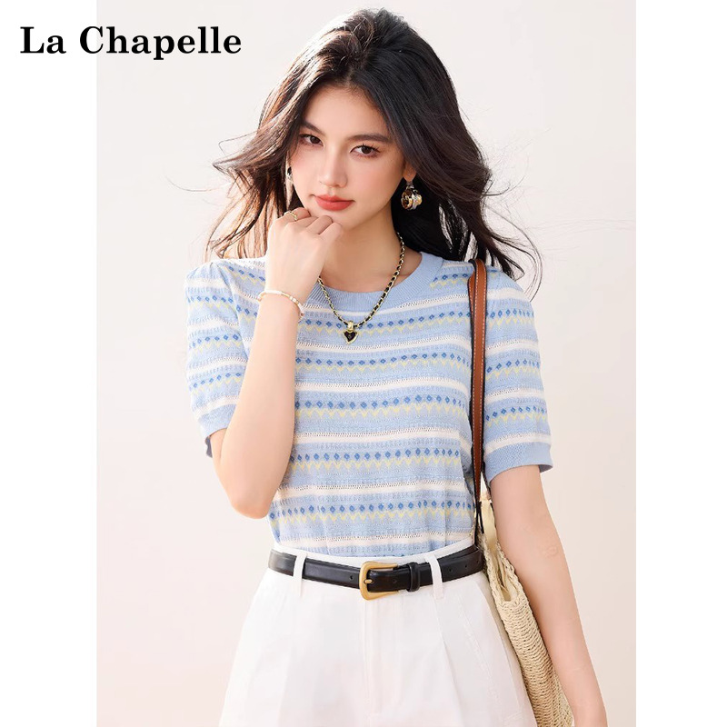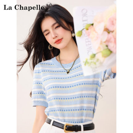 拉夏贝尔短袖撞色针织衫女2025春季新款修身打底正肩条纹蓝色上衣