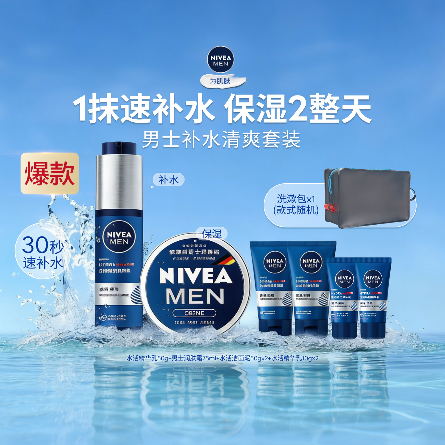 妮维雅男士水活畅透精华露小蓝管+男士润肤面霜套装滋润护肤补水