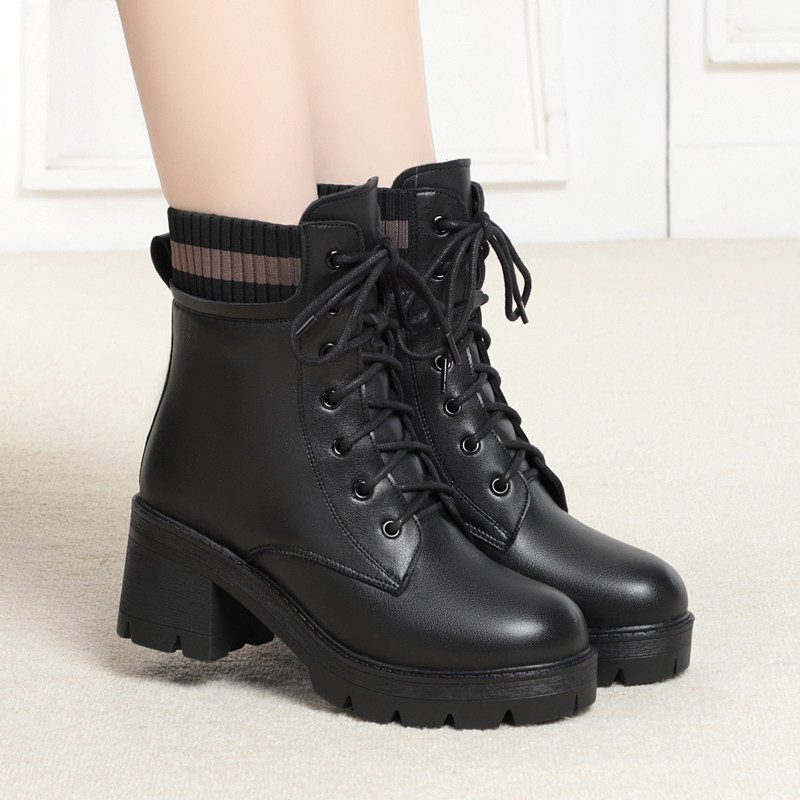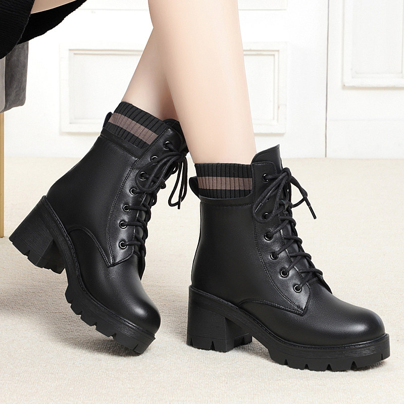 意尔康女鞋马丁靴女冬季加绒保暖百搭厚底短靴粗跟机车靴羊毛女靴