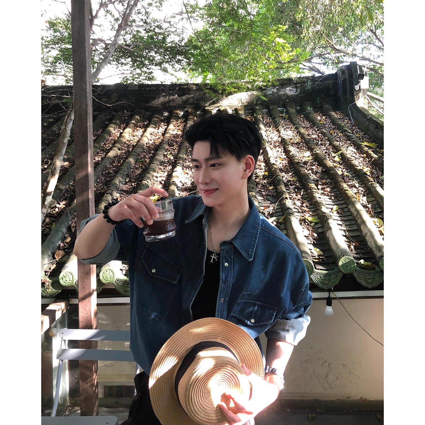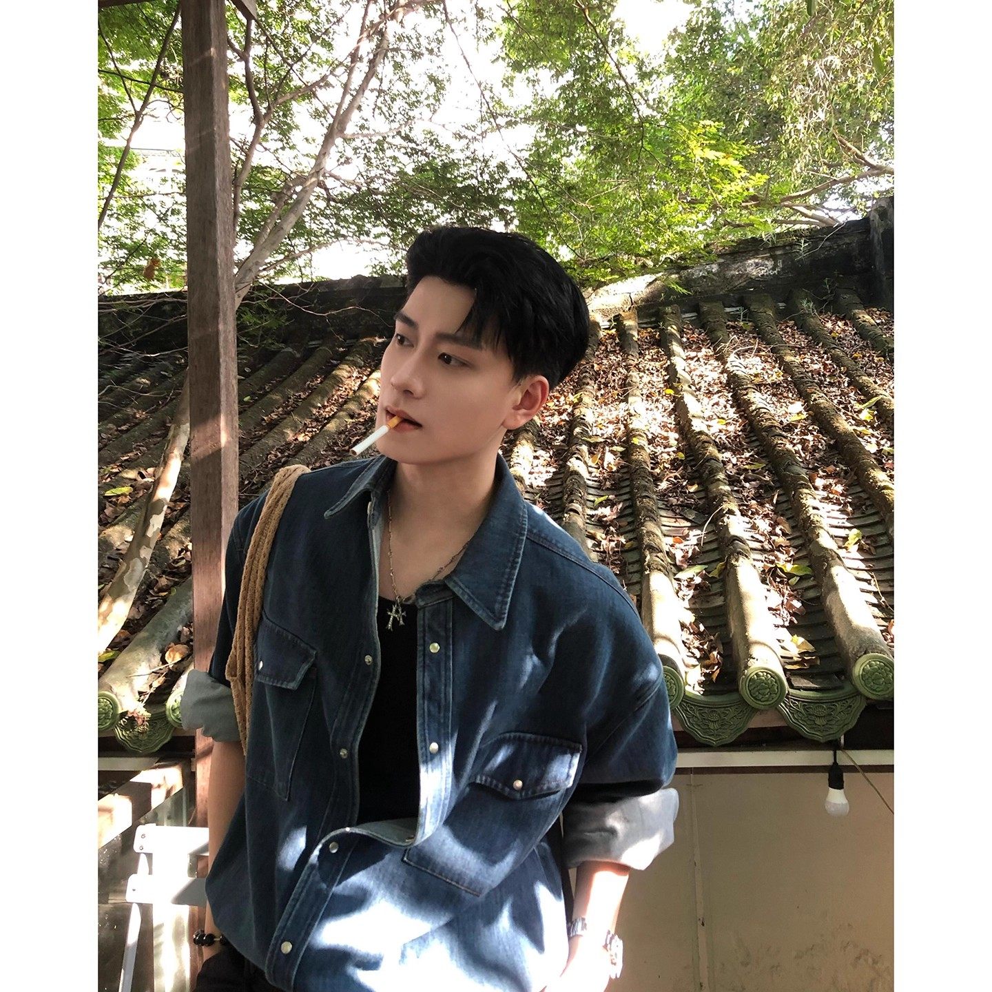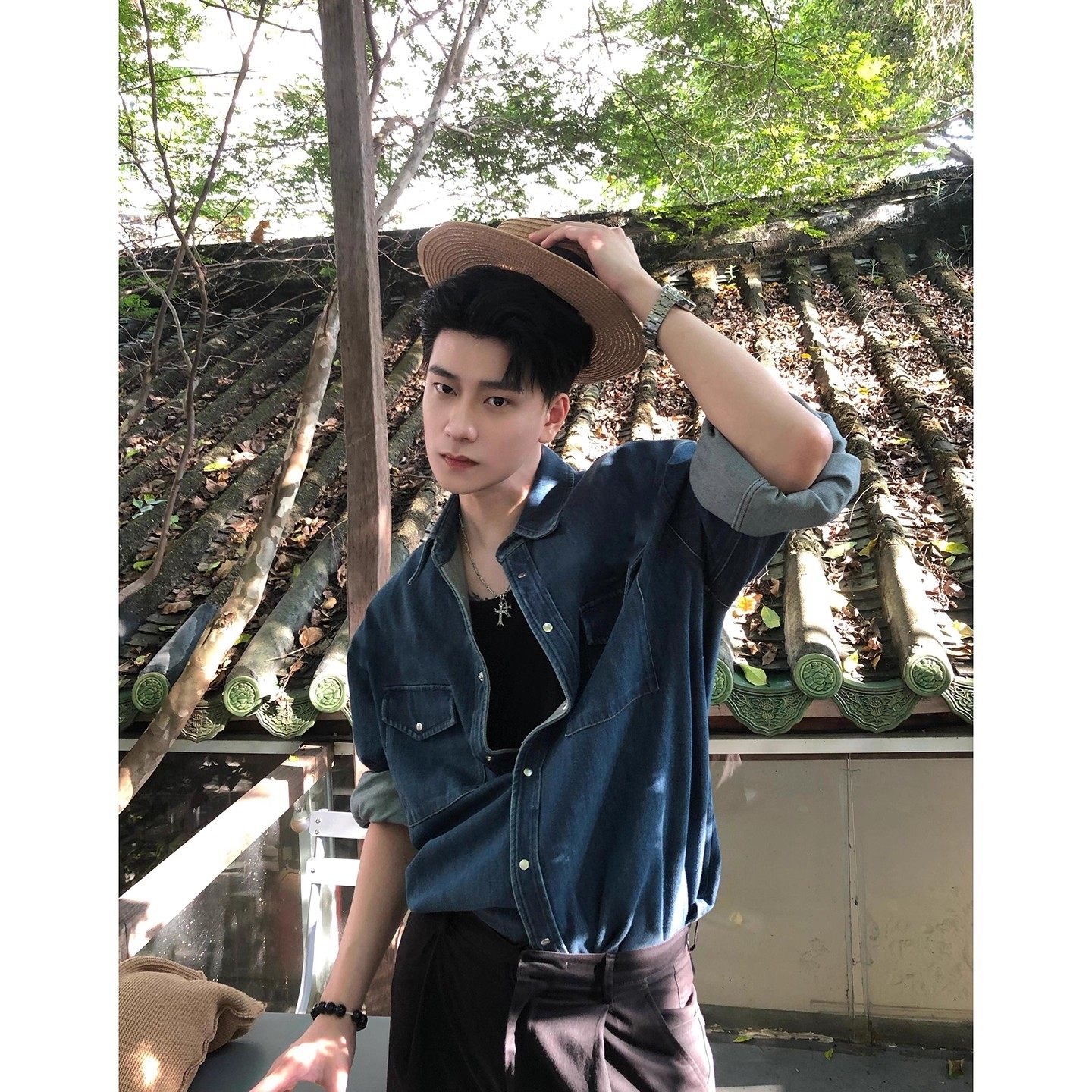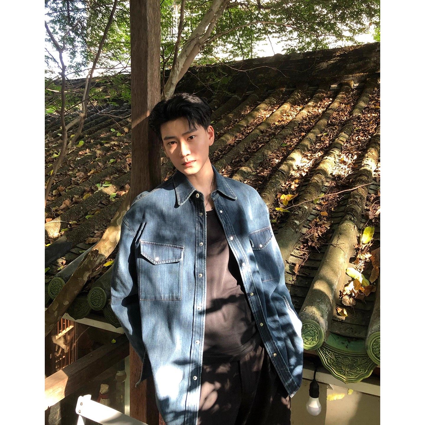 深蓝色牛仔衬衫男轻奢高级感套装秋季韩系宽松慵懒风正肩工装衬衣