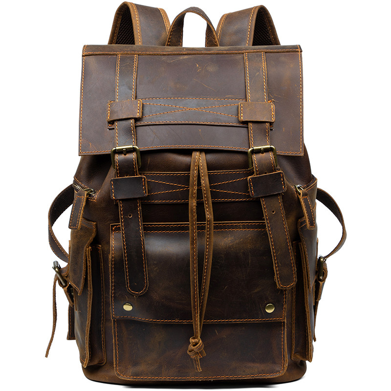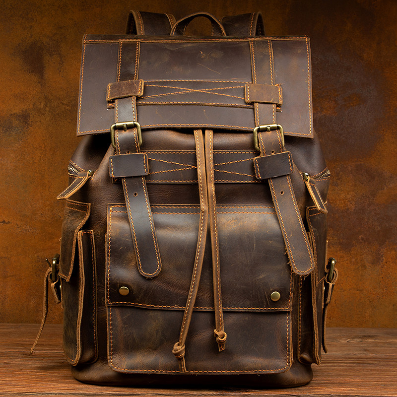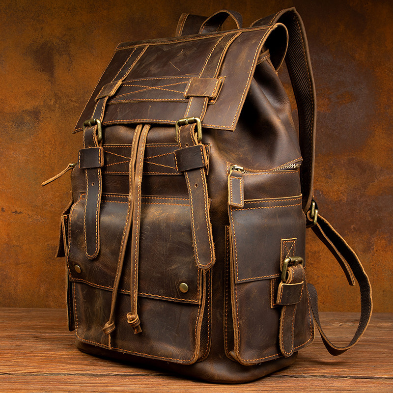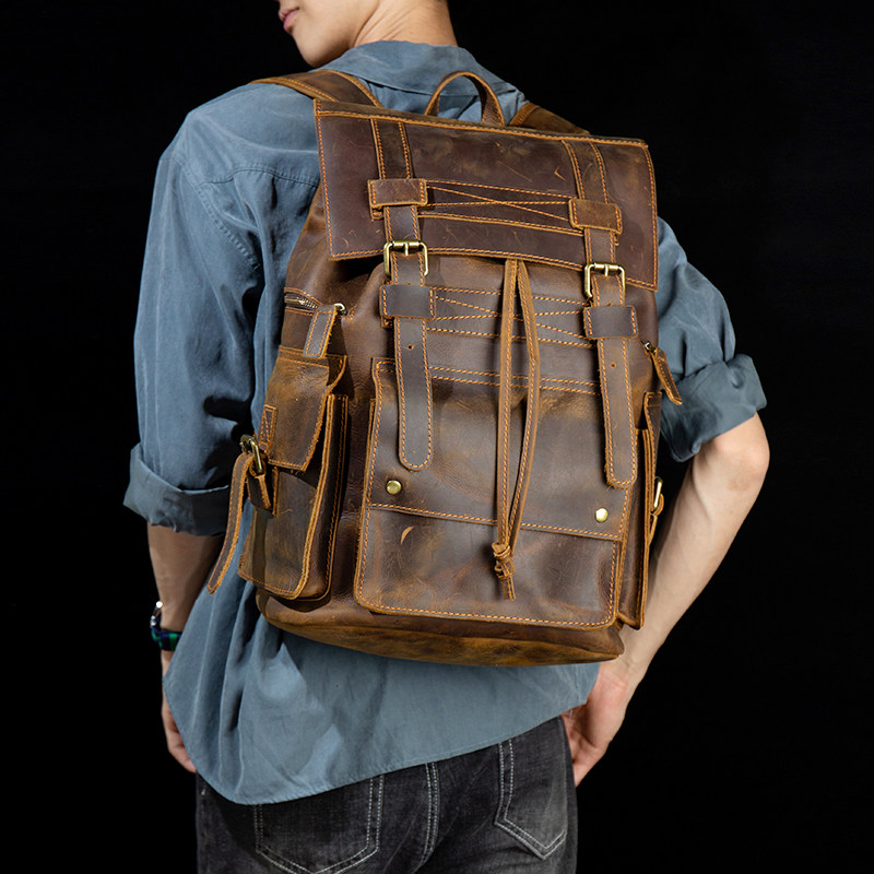 慢时光复古疯马皮双肩包男大容量旅行背包男士电脑包欧美双肩背包