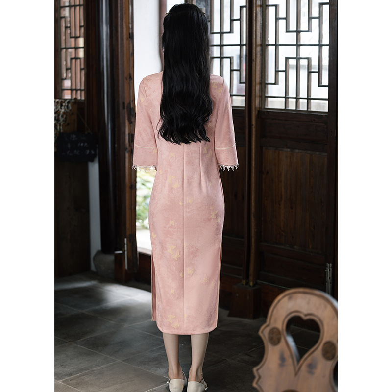 2025春秋新款麂皮绒旗袍连衣裙七分袖长款日常改良旗年轻礼服女装