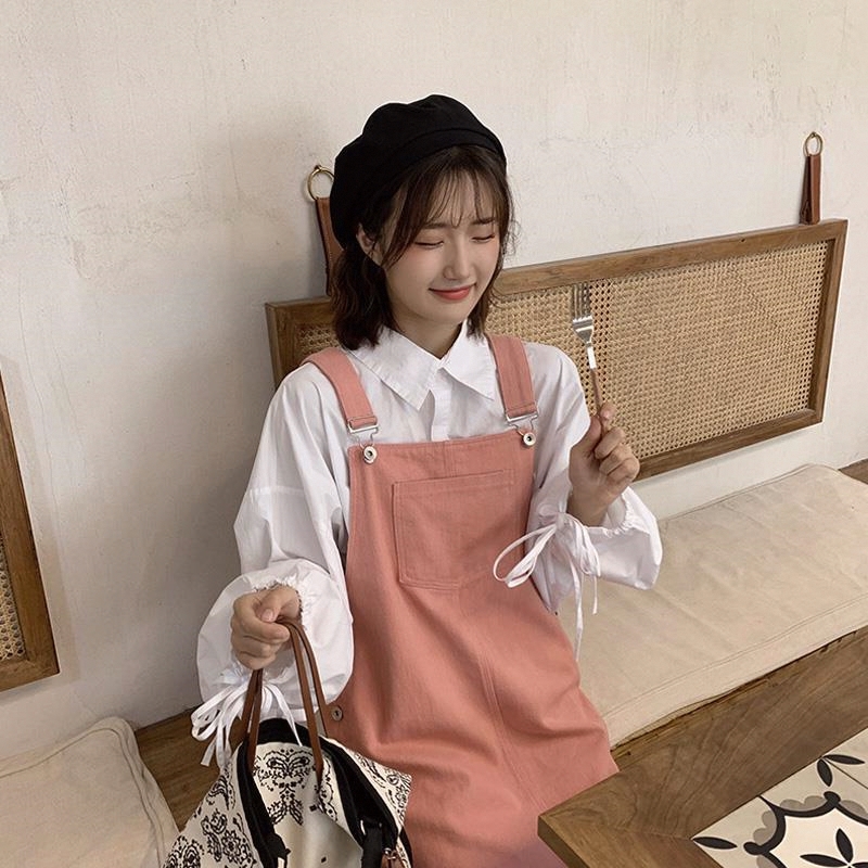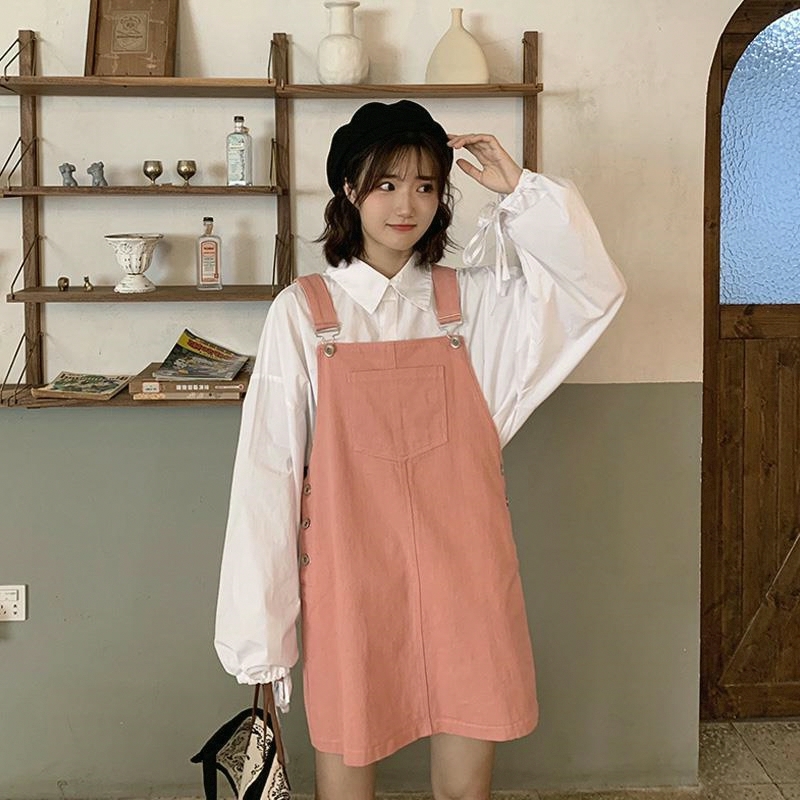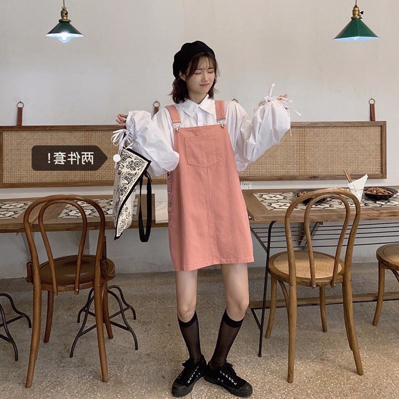 春秋2025新款韩版粉色背带裙+白色衬衫时尚两件套网红气质套装女
