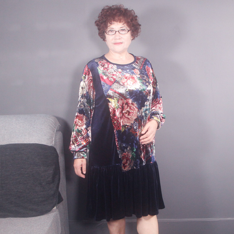中老年春秋印花丝绒长袖连衣裙加大码胖妈妈款宽松显瘦中长款上衣