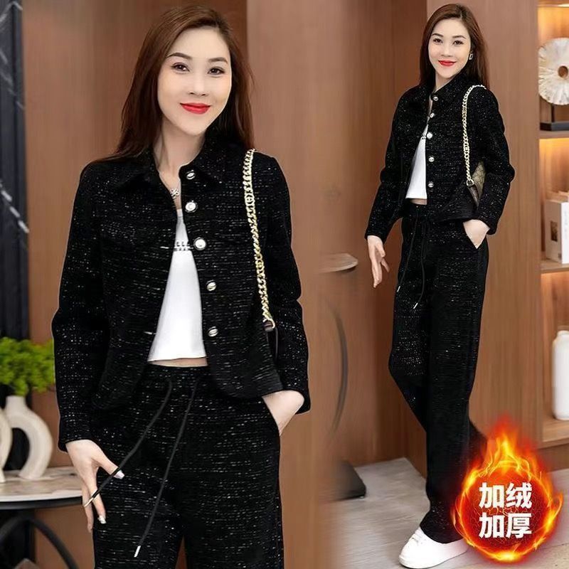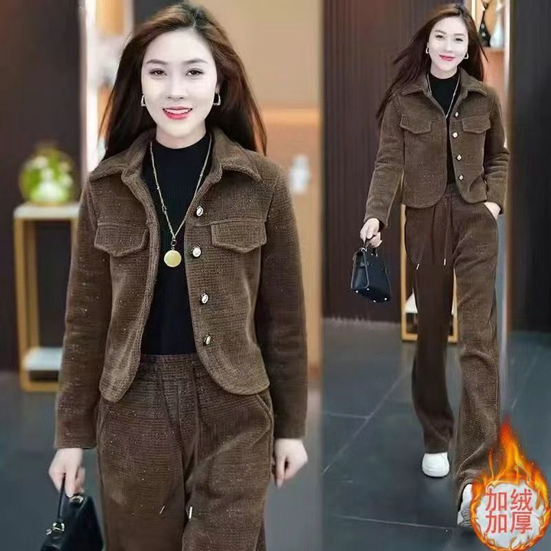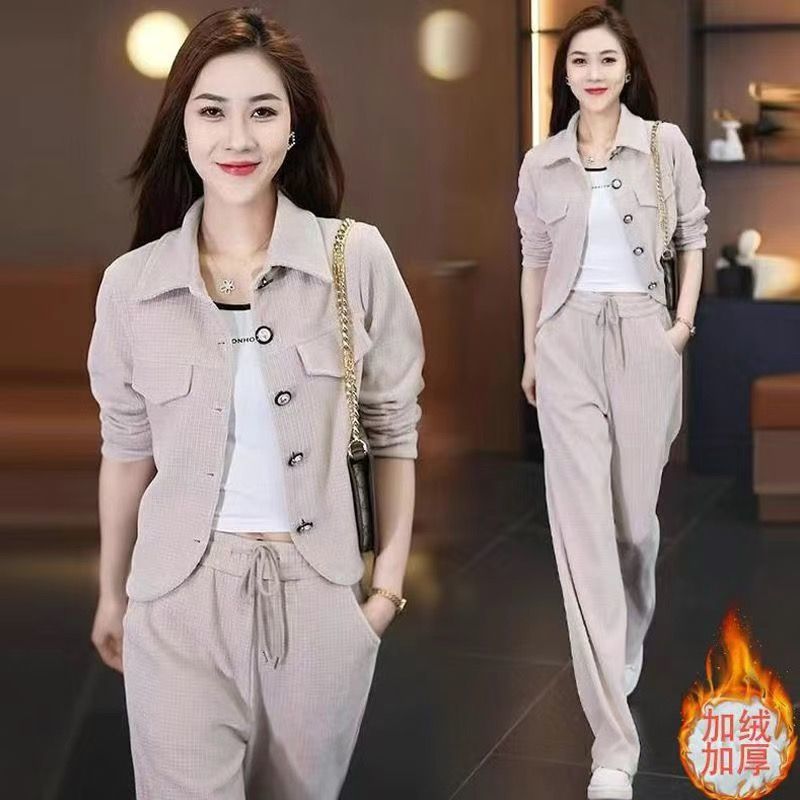 加绒加绒休闲运动套装女2025冬季新款时尚开衫外套阔腿裤两件套潮