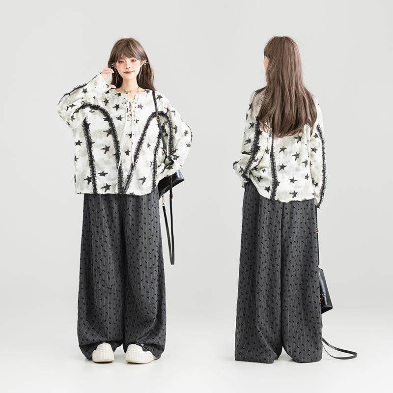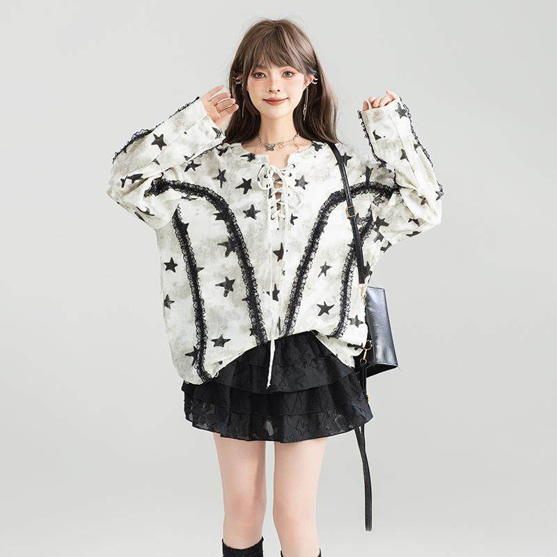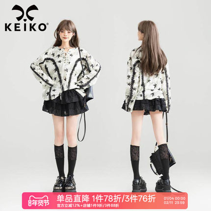 KEIKO 蕾丝花边饰磨料做旧长袖上衣女26春季星形图案宽松绑带t恤